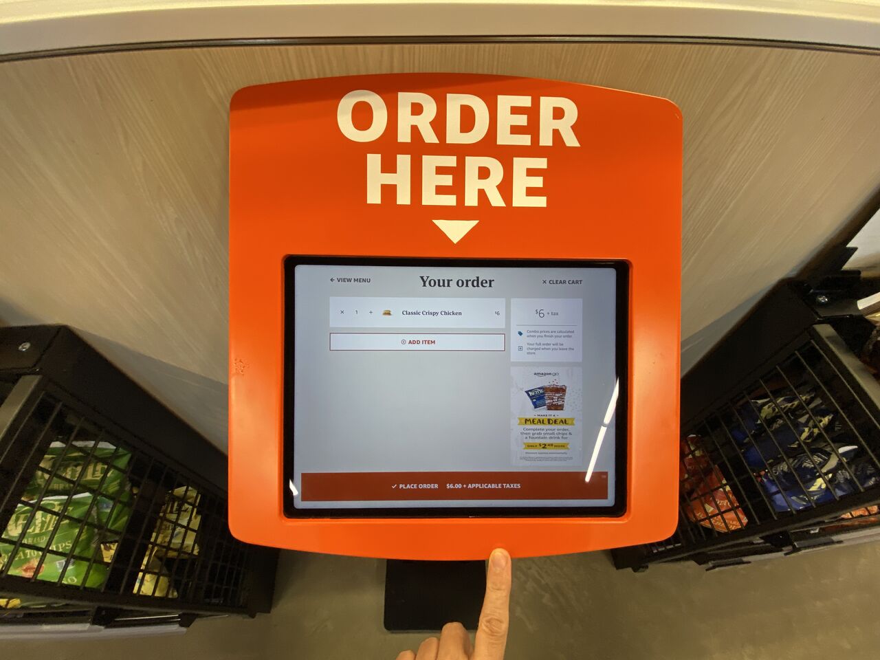 飲食メニューの注文は2台の注文端末から行う。専用の端末ではクレカ等の支払い決済が必要ない。最後に自分の名前等を入力するだけ。シェフからサンドイッチ等を渡されたときにジャスト・ウォークアウトのバーチャル・ショッピングカートに商品が追加されるのだ。