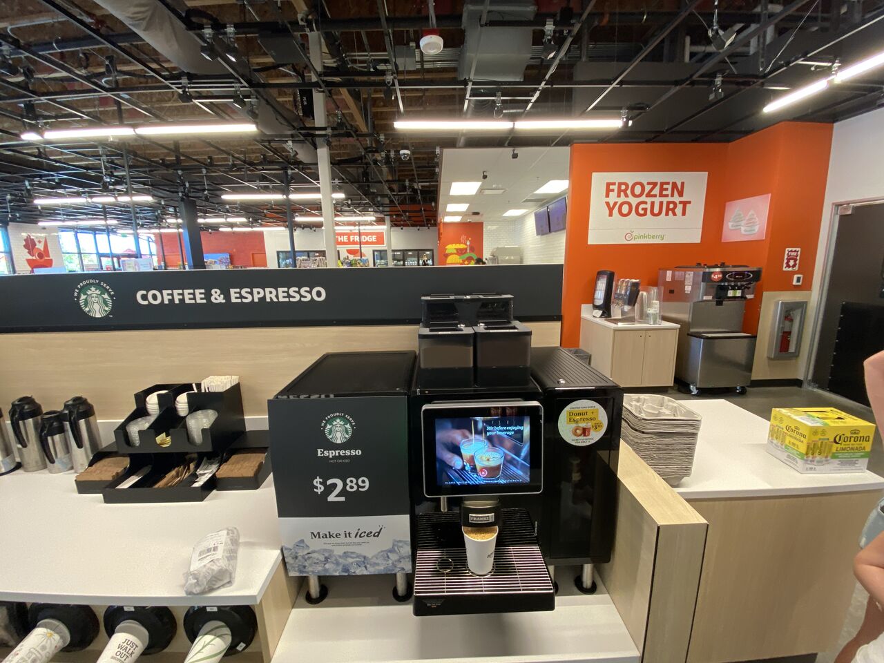 ラテやモカなどコーヒーはセルフサービス・マシン。右後ろにはフローズン・ヨーグルト・マシンも見える。