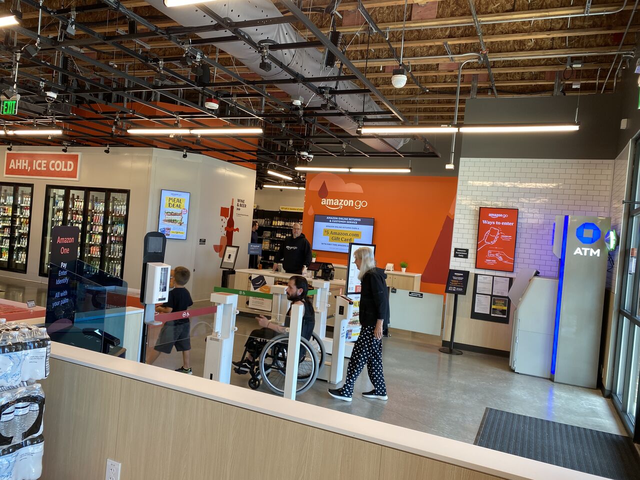 もしくは生体認証の「アマゾン・ワン(Amazon One)」に事前に登録しておけば手のひらをかざすことでゲートが開いて入店できるのだ。ゲートでクレジットカードを挿し込むことでもアマゾンにアカウントがなくても入店できるようになっている。