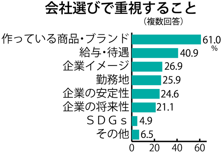 就職する会社を選ぶ際に重視することは、「作っている商品・ブランド」「給与・待遇」が前年同様に1、2位となり、比率をそれぞれ5ポイント以上上げた。3位の「企業イメージ」は前年4位、4位の「勤務地」は前年5位から浮上した。コロナ禍を通じ、会社を選ぶ時の見方も多少変わってきた。