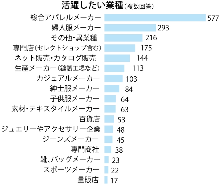 活躍したい業種については、1位「総合アパレルメーカー」と、2位「婦人服メーカー」は前年と同じ。3位「その他・異業種」と4位「専門店」は前年と順位が入れ替わった。その他・異業種の記述には、衣装をはじめ、スタイリスト、ブライダル、古着屋が目立った。ほかに前年から順位を上げたのは5位「ネット販売・カタログ販売」(前年7位)、8位「紳士服メーカー」(9位)、11位「百貨店」(14位)、16位「スポーツメーカー」(17位)。