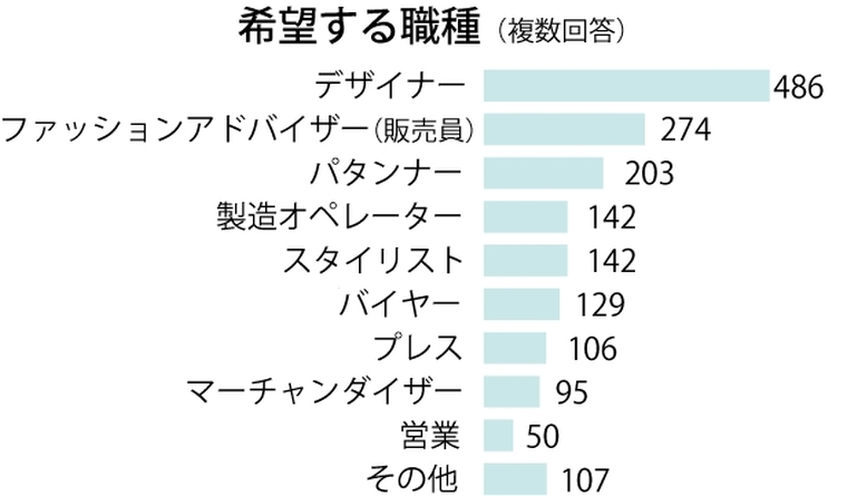 希望する職種は、1~3位が順に「デザイナー」「ファッションアドバイザー」「パタンナー」で前年と同じ。4位は前年に続く「製造オペレーター」と、前年7位だった「スタイリスト」の両者になった。1~4位について、回答者数に対する比率を見ると、デザイナーが2.2ポイント上昇、スタイリストが2.1ポイント上昇したのに対し、これら以外は全て比率が下がった。