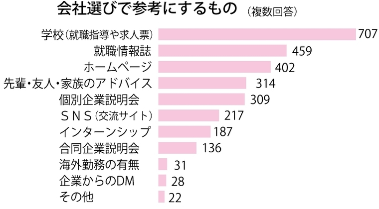 就職する会社を選ぶ時に参考にするものについては、前年と全く同じ順位という結果になった。コロナ禍以降、就職難が続いてきたこともあり、1位の「学校」は、回答者数に占める比率が7.7ポイント増の51.3%となった。