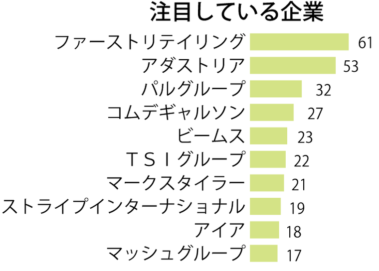 「注目している企業」は、ファーストリテイリング(ユニクロ含む)が3年連続で1位となった。理由は売り上げ規模が大きいことをはじめ「全世代に支持されている」「協業や戦略が面白い」「SDGs(持続可能な開発目標)への取り組み」「値上げでどうなるのか」「危機的な円安にどう対応していくのか」などがあった。