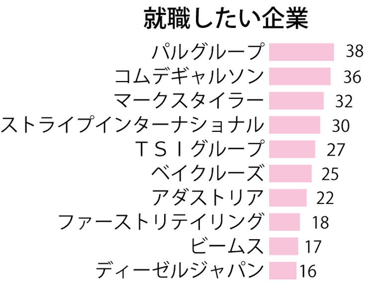 「就職したい企業」はパルグループが初めて1位になった。前年は5位だった。「好きなブランドがある」はもちろん、「実力主義」「積極的に挑戦することができる」などを理由に挙げる声も多かった。