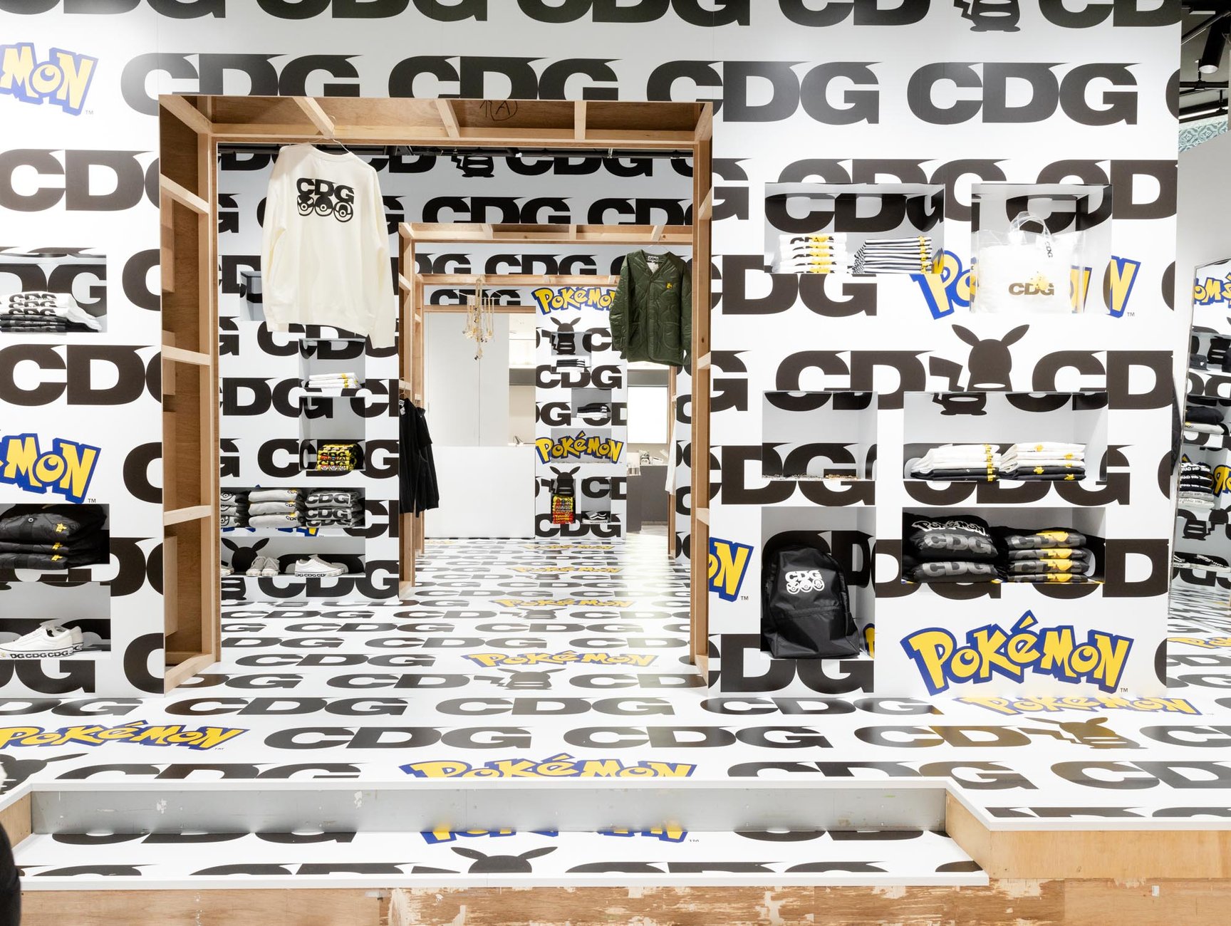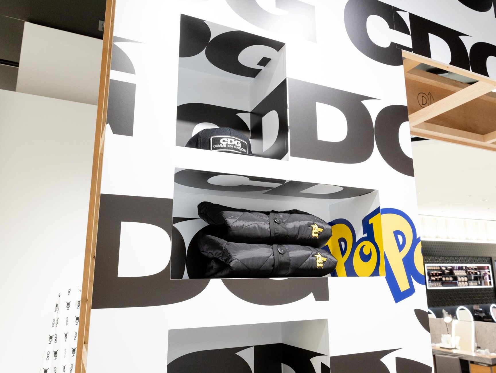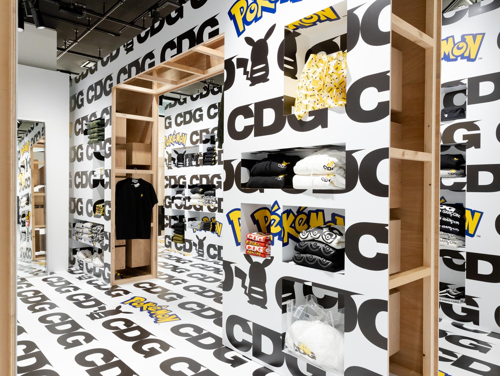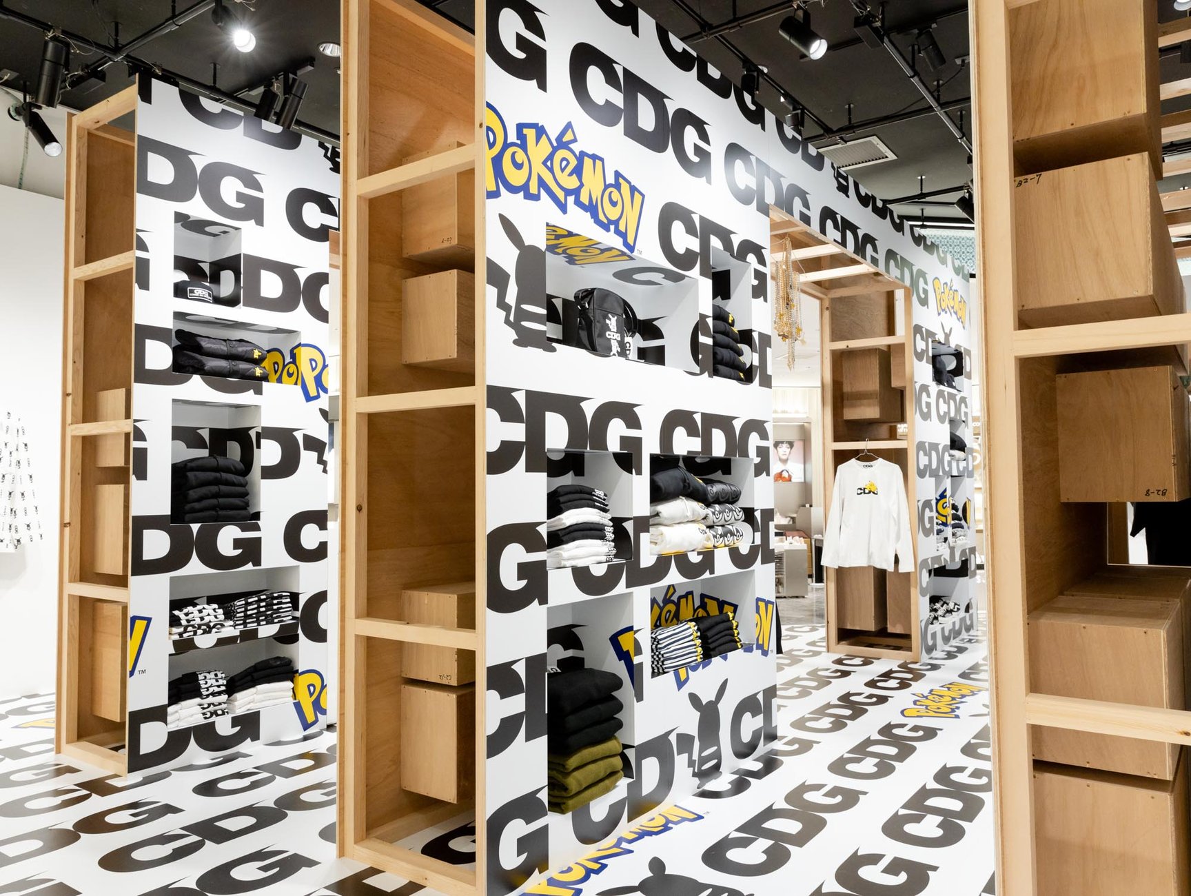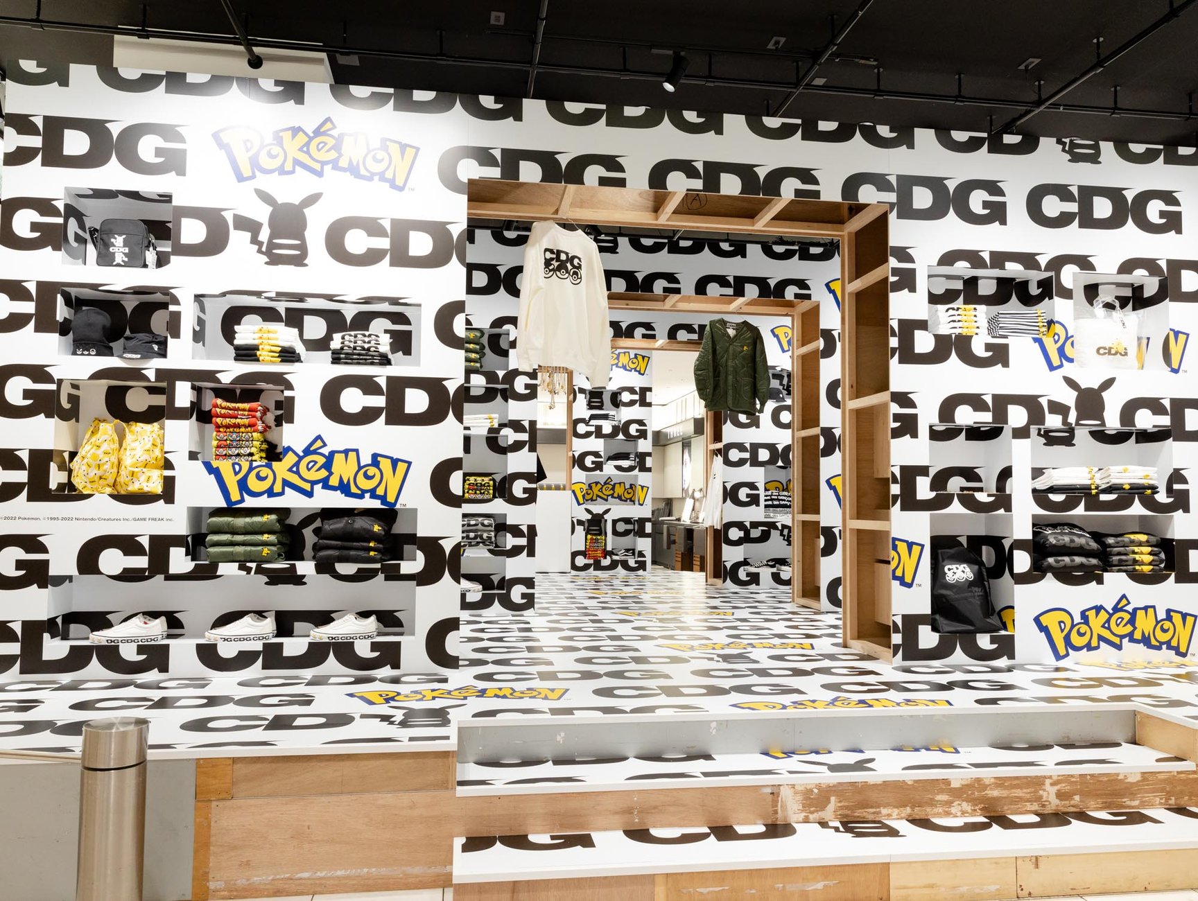 コム デ ギャルソンによる伊勢丹新宿店本館1階ザ・ステージでのイベントは、2016年に開催された「ディアンドデパートメント(D&DEPARTMENT)」とのコラボ「グッド デザイン ショップ(GOOD DESIGN SHOP)」以来。ポケモンでは、2019年に藤原ヒロシとの合同プロジェクト「THUNDERBOLT PROJECT」のポップアップストアが伊勢丹新宿店メンズ館で開催されたが、今回はウィメンズやキッズも楽しめるアイテムが多いことから本館1階ザ・ステージでの開催に至った。会場は、シーディージーでお馴染みの壁や床の全面にロゴ配した内装で、ポケモンのロゴとピカチュウの背面を加えたコラボ特別仕様にアレンジ。窪みに商品を並べたアーチを3つ設置しており、アーチを潜りながら商品を探し冒険しているかのような雰囲気を演出した。窪みの内側にもグラフィックをあしった反面、アーチの側面は内側の樽木が見えるよう仕上げた。