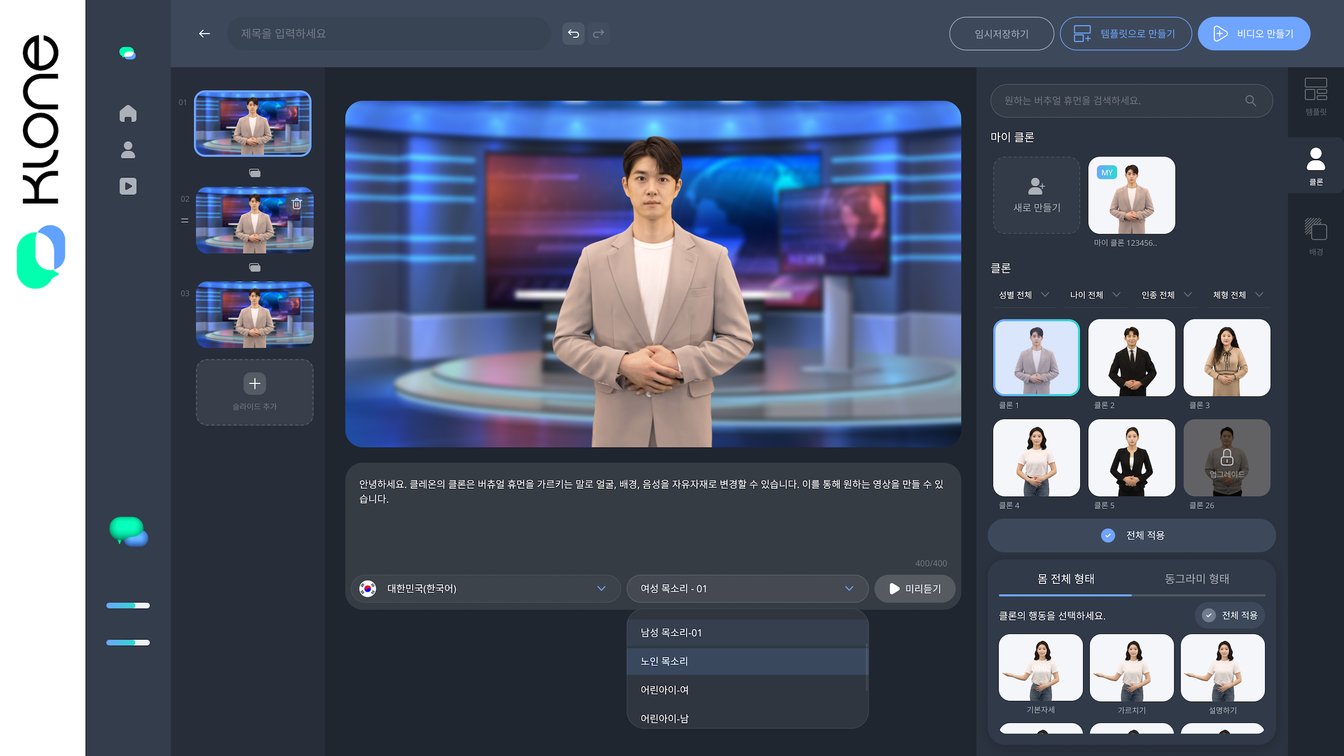 Kloneとは、同社が生成するデジタルヒューマンの総称である。クローンサービスが提供するリソースを活用してデジタルヒューマンコンテンツを制作することから、顔写真1枚でカスタムされたクローンを生成し、希望する形のコンテンツを作成することもできる。