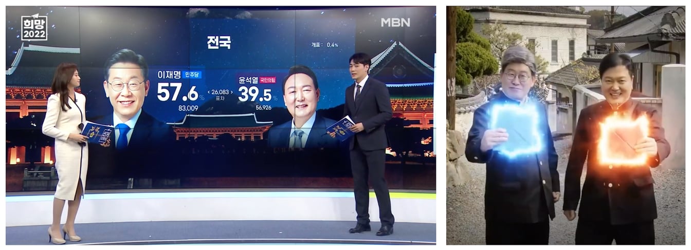 韓国の開票実況番組は最新情報を伝えるだけではなく、エンターテインメント番組としての性格が共存している。そのことに着目し、普段の候補らからは見つけにくいユーモラスかつ親しみやすい感情表現の再現を試みたという。