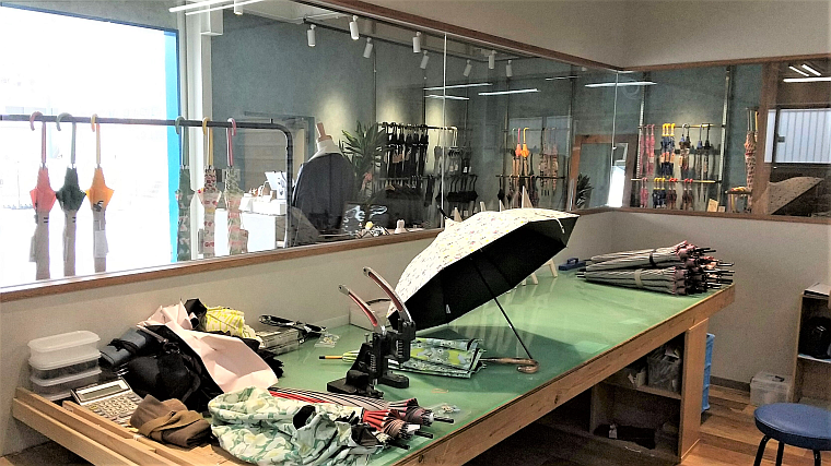 カムアクロス(大阪府東大阪市)は5月、本社ビル1階に初の直営店「カムアクロスファクトリーストア」を開いた。自社商品中心に個性的なレイングッズを揃える。製作や修理の工房がガラス越しに見える設計だ。