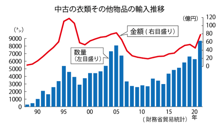 財務省の貿易統計によると、「中古の衣類その他の物品」の輸入量は、21年に最高の8701トンになった。それまでで年間輸入量が最も多かったのは05年の8082トン。22年は1~6月の速報値が前年比12.3%増の4995トンで、金額は52億4600万円(46.4%増)だった。円安が続き、1キログラム当たりの輸入単価は3月から1000円超が続いている。22年は年間で1キログラム当たり約896円。輸入単価は、過去に何度も1キログラム当たり1000円を超えた年がある。1000円超となった年は07年以来。07年は08年に1000円を割り、輸入量も減少に転じたが、その前の90~06年はずっと1000円以上が続き、92~98年は2000円以上を記録している。これまで輸入量が大きかった95年と05年の二つのピーク時の為替は、22年よりも円高。過去最高を更新した21年は05年と変わらない相場だった。22年から急激に進む円安で、後半の輸入がどうなるか気になる。