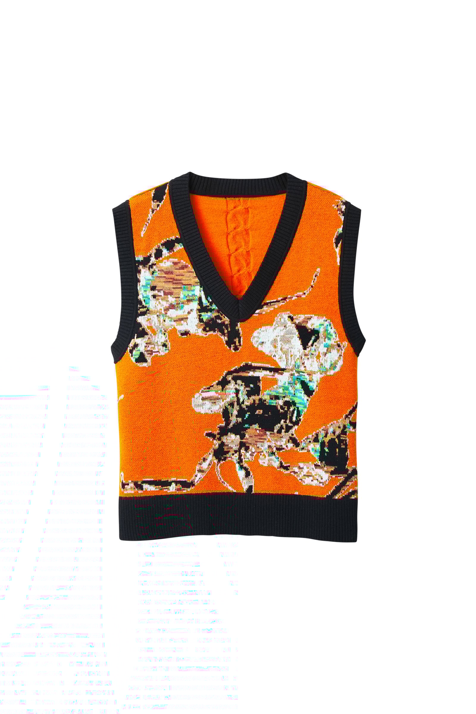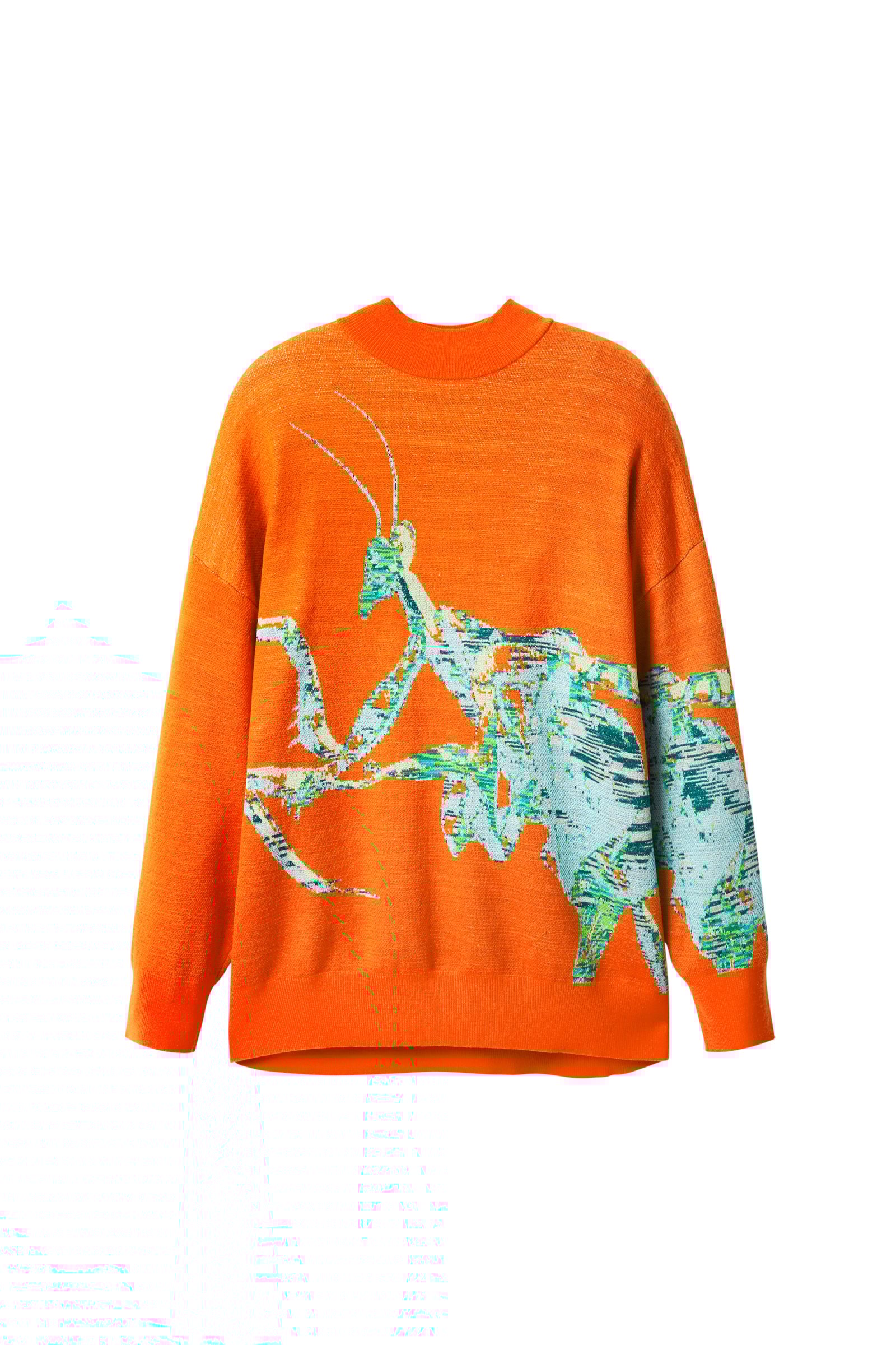 コラボでは、カマキリをモチーフにしたアイテムやデシグアルのアーカイヴから着想した20点のアイテムを製作。一見花柄のように見えるカマキリの格子模様をプリントしたトップス(1万4900円)とドレス(2万9900円)、カマキリをデジタルアート風に表現したジャカードベストトップ(1万5900円)、カマキリの頭部を表現したバッグ(4万9900円)、胸元に結び目をデザインしたスウェット(1万7900円)、アシッドウォッシュ加工を施したフューシャピンクのデニムジャケット(2万9900円)、ボトムス(1万9900円)、スカート(1万7900円)などをラインナップしている。このほか、銀座店限定のアイテムとしてウォッシュ加工を施した複数のデニムを組み合わせたセットアップのジャケット(4万9900円)とボトムス(3万9900円/いずれも税込)も揃える。