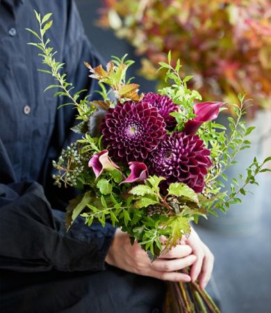 「秋色ダリアのブーケレッスン」では、花屋でもひときわ存在感のあるダリアを贅沢に、秋の枝ものと束ねたブーケをつくる。レッスン後はダリアをイメージした特別スイーツも楽しめる。