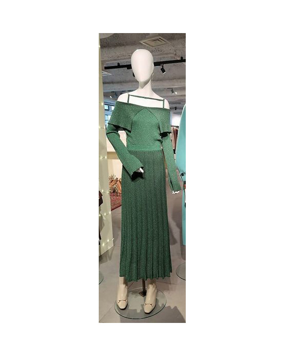 「リリーブラウン」は、ドレッシーなアイテムから日常で使えるものまでキラキラが豊富だ。大きな襟がポイントのニットワンピースは同色の糸とラメの撚糸を全体に使い華やか。襟元はオフショルダーのほか、襟を肩に乗せたり、ひもを取り外したり、着こなしを変えられる。税込み1万6940円。