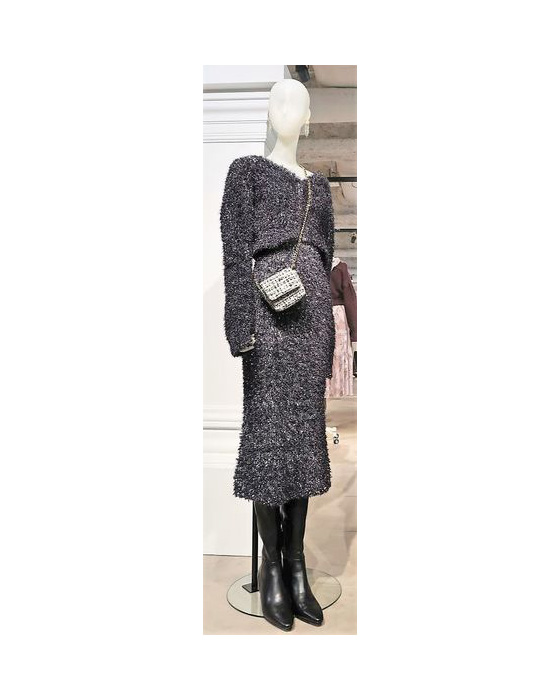 「スナイデル」は、ホリデーシーズンの気分を高める、きらびやかな洋服やバッグを出す。ファンシーヤーンとラメ糸を引き揃えた編地のショート丈のカーディガンは、金属ボタンで華やかさを加えた。1万3420円。同素材のスカートもある。