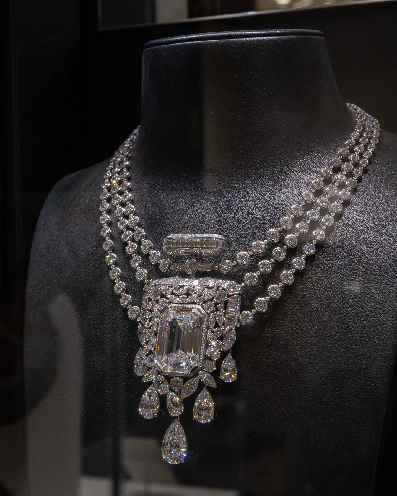 1階はファイン ジュエリー、ウォッチのフロア。人気の「ココ クラッシュ」をはじめ、「カメリア コレクション」「シャネル N°5」などアイコニックなジュエリーやウォッチをラインナップする。2階のハイ ジュエリーのフロアには、オープンを記念し、アイコニックなフレグランス「シャネル N°5」の生誕100周年で昨年発表された「コレクション N°5」のマスターピースがフランスから初来日。ボトルデザインからインスピレーションを得たネックレスは、ダイヤモンドの中でも炭素だけで生成された非常に希少な「タイプ2A ダイヤモンド」が使用され、55.55カラットの輝きを放つ。(10月末まで展示)また、N°5の原材料として使用されるイランイランやジャスミンをモチーフにしたハイ ジュエリーなどもディスプレイ。