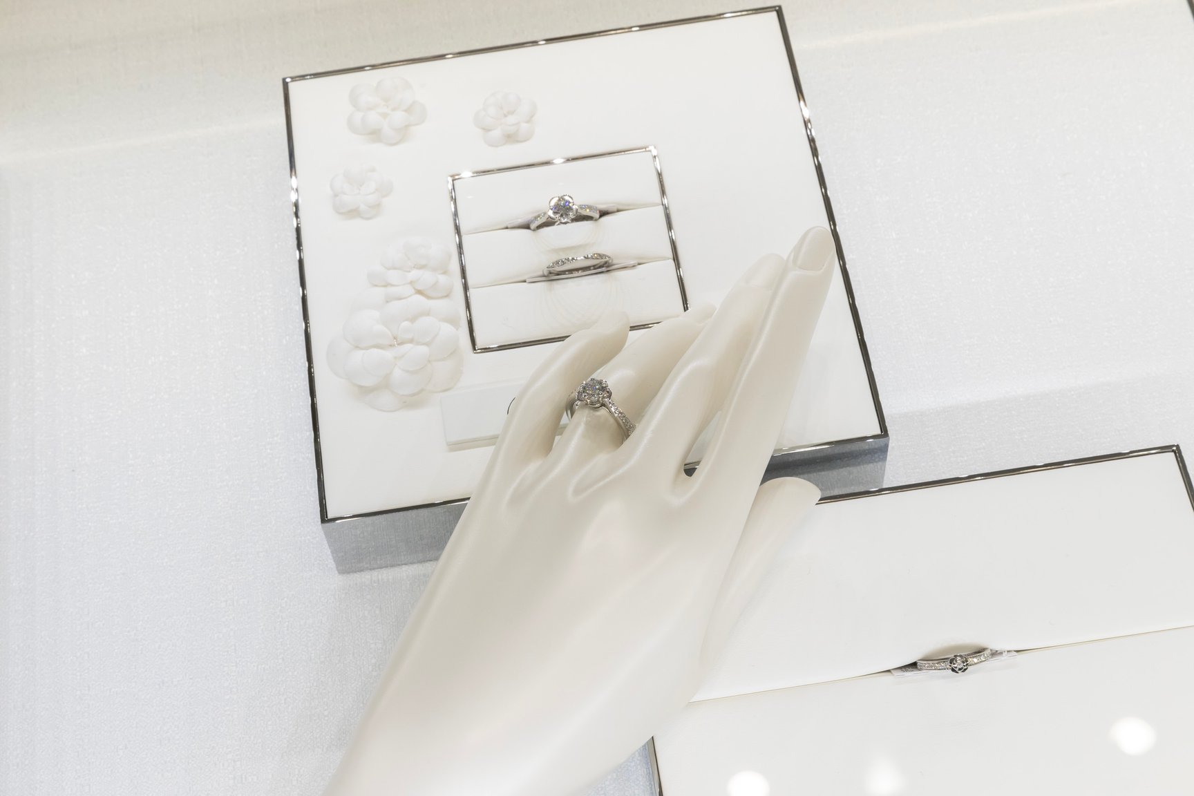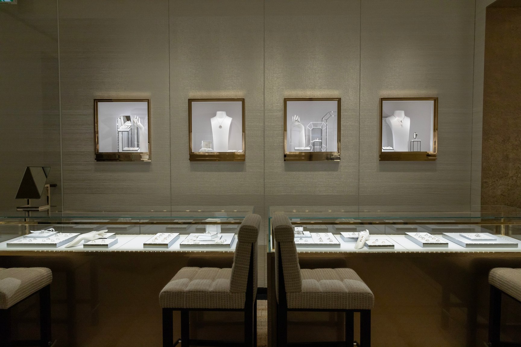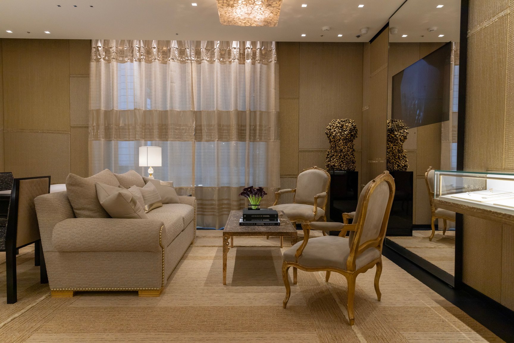 店舗は、今年5月にリニューアルオープンしたパリ・ヴァンドーム広場の「シャネル ファイン ジュエリー パリ本店」と同様、建築家のピーター・マリノが設計。内装は白、黒、ベージュ、ゴールドを基調に、フロアごとのコンセプトに沿った美術品やインテリアを配置した。シャネルツイードを想起させるカーペットをはじめ、一部フロアでは職人により塗装された漆喰の壁、京都西陣のHosoo製の西陣織の壁紙を採用するなど、日本の伝統工芸の技術も随所に取り入れ、細部に至るまでこだわりが詰め込まれている。