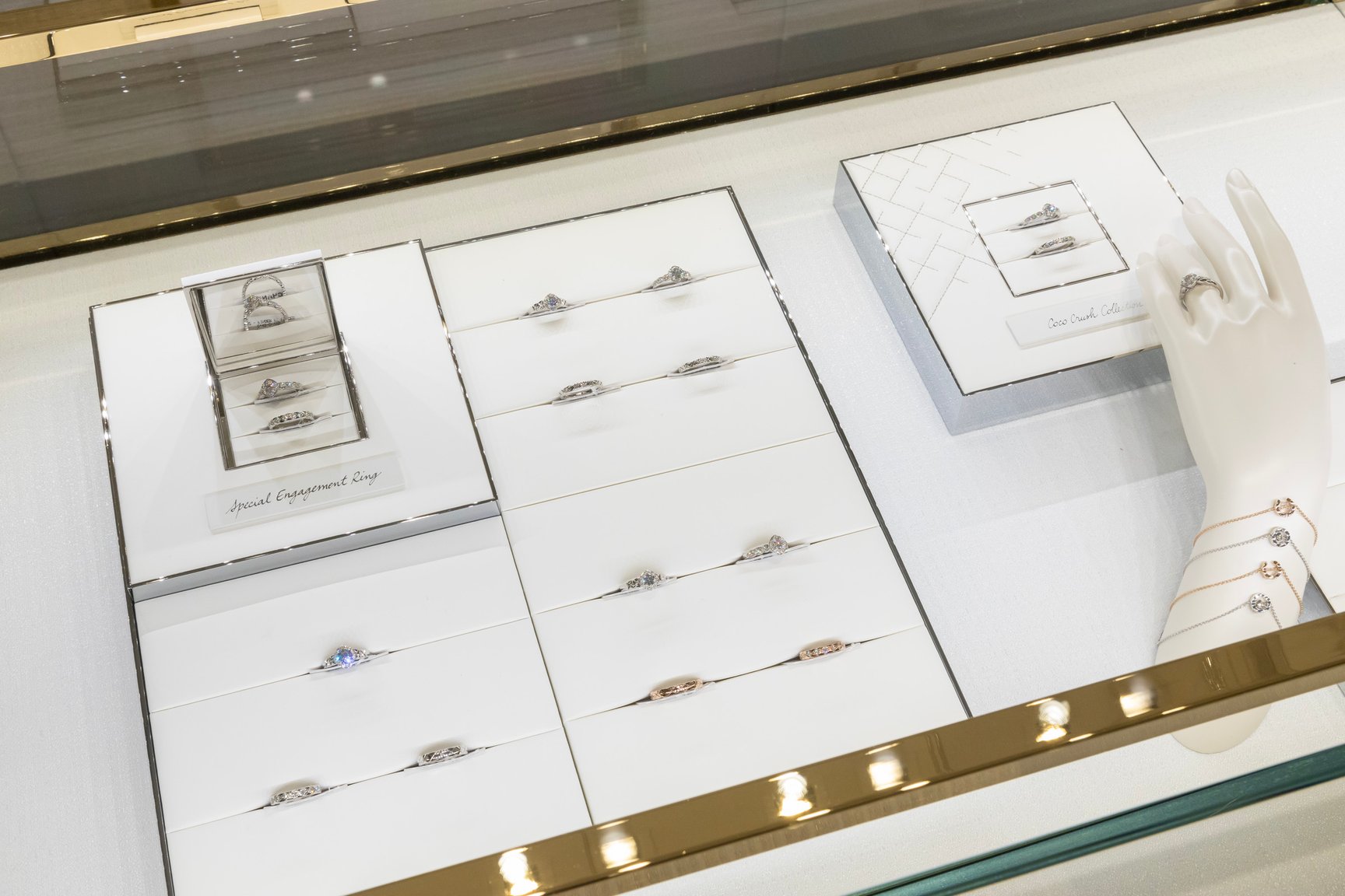 3階のメンズウォッチのコーナーは本棚の什器が設えられたシックな空間で、38mmや40mmの男性向けのウォッチをセレクトして展示。ブライダルコレクションはラインナップ豊富に取り揃えている。