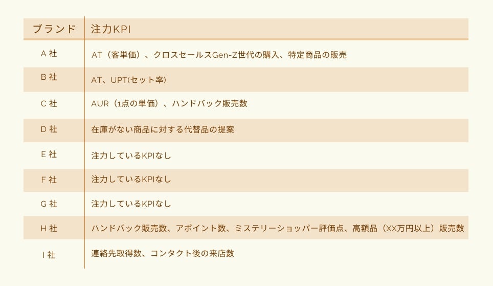 驚いたのは「KPIは特にない」という販売現場があったということ。またKPIはあるものの、戦略的に本部から指示があるわけではないというブランドもありました。ブランドによって、そして扱う商材によっても大きく異なることがわかりました。