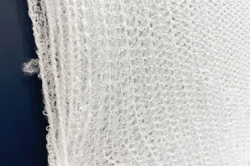 素材には、昭和46年に創業し長繊維の加工を得意とする金田繊維が石川県の協力企業と収縮加工から生地の編立、縫製まで共同で手掛けた人工中綿生地「ノミ ウォーマー(Nomi Warmer)」を採用。長繊維を複合的に特殊な技術で収縮編立加工し、その後ミルフィーユ状に何層も重ね合わせ、空気の層を作ることで、天然ダウンに匹敵する保湿性と吸放湿性を備えたほか、短繊維では実現できない高いストレッチ性を併せ持たせた。長繊維が連結しているため、天然ダウンや短繊維綿のような毛羽立ちがなく、埃が発生しにくいため、アレルギー対策としての打ち出しも視野に入れる。なお同素材はすでに特許取得済みで、2022年度の「プレミアム石川ブランド認定製品」に選出された。