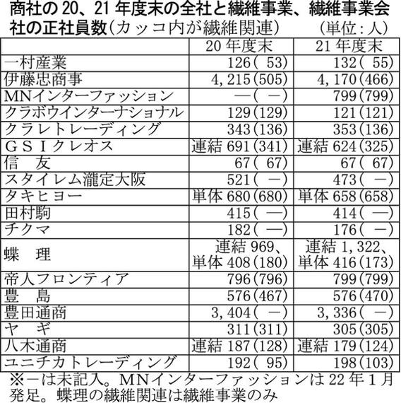 繊研新聞社は繊維事業を手掛ける商社に対し、「若手・中堅社員育成に関するアンケート」を実施した。その中から直近の正社員の人数とその増減をまとめた=表。多くの企業で人員が減っている。回答企業のうち、繊維関連に携わる正社員数が20年度と比べて増えたのは一村産業、帝人フロンティア、豊島、ユニチカトレーディングの4社のみ。前年並みが3社(クラレトレーディング、信友、田村駒)で、それ以外は減った。大幅減が目立つ企業もある。
