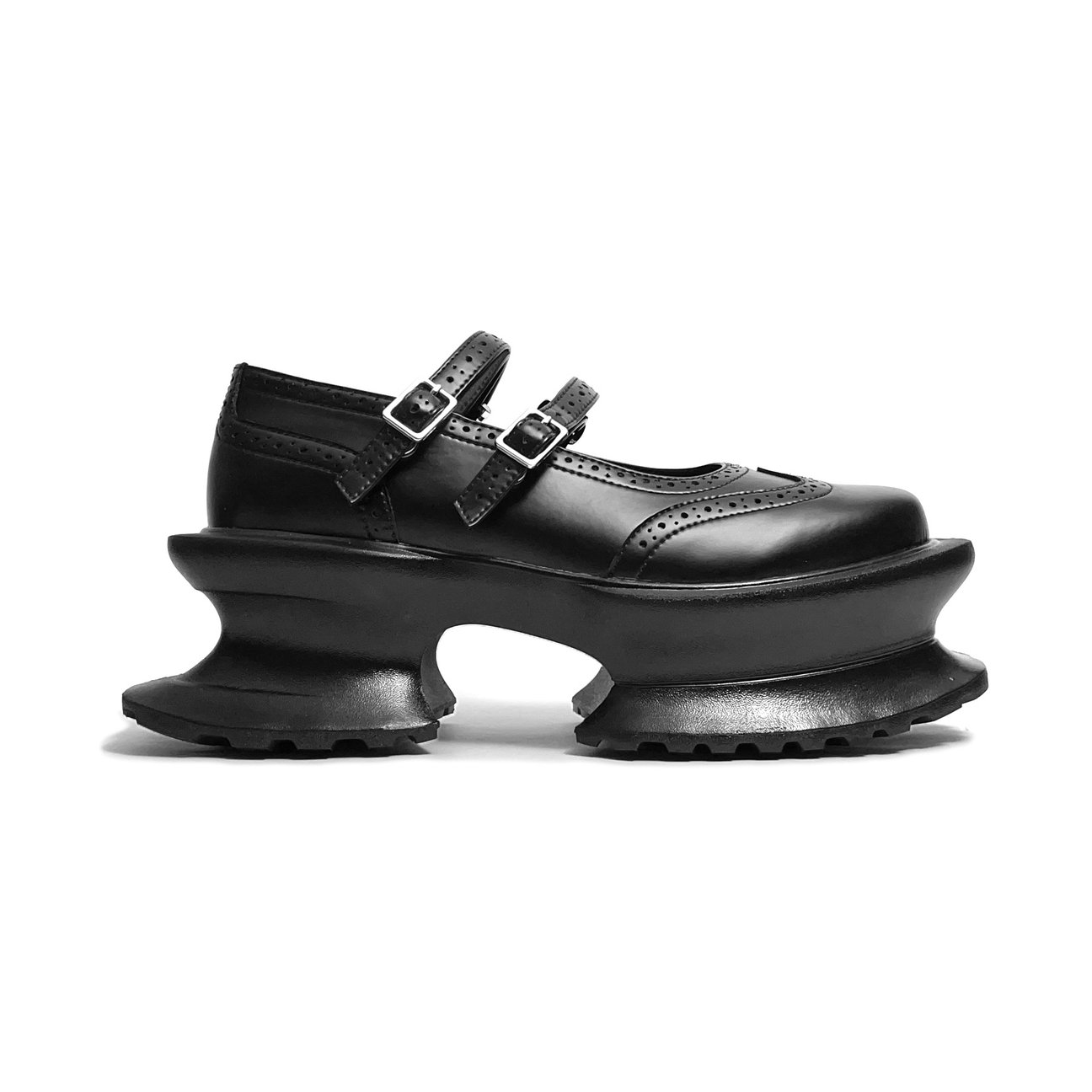 エアリアル ガーデンは3D技術を用いて作られた完全オリジナルのシューズ。メリージェーンとブローグディテールのアッパーに、6.5cmのアウトソールにはこれまでと同様にスニーカー素材を採⽤した。カラーは「Black leather×BK」(3万9600円)、「Black leather×jade」(4万9500円)、「Red leather×jade」(4万9500円/いずれも税込)の全3⾊、サイズは22~26cmを用意。ブラックカラーと鉱物の翡翠パターンをテキスタイルに使用した。受注販売はポップアップストアが11月27日まで、オンラインストアが12月11日まで受け付ける。