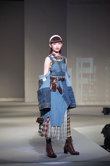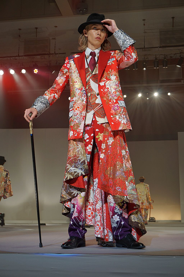 エドウインが提供したジーンズでは、チェックの生地などを組み合わせてリメイクし、日常に溶け込むワークウェアを制作。鮮やかな花柄と英語で平和や愛と描いた生地を使い、MA-1をリメイクした量感のあるアウトドアスタイルなど、リアル服が増加。服を汚さないために盛装する平和主義者〝サプール〟をイメージし、豪華なきものをアップサイクルしたフォーマル服で、とりを飾った。