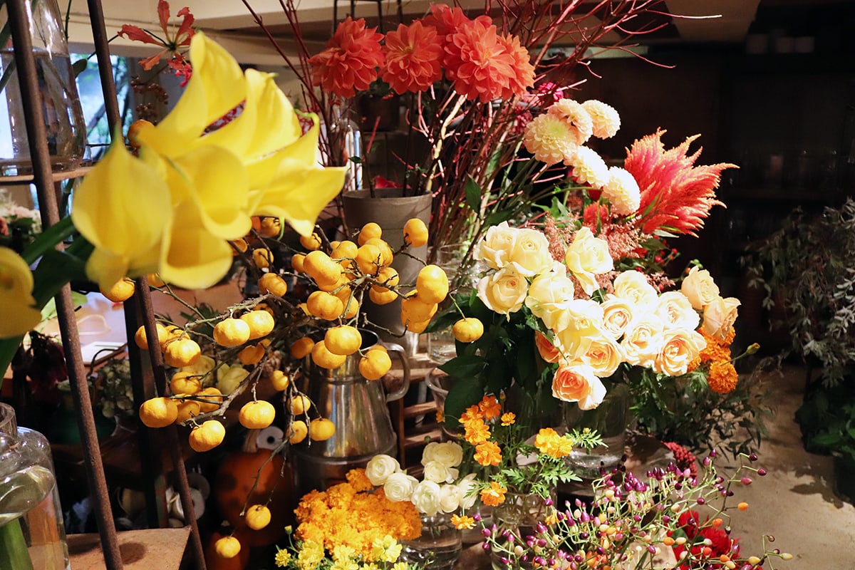 花の旬を大切にしているル・ベスべでは、グラデーションのように繊細な、季節に応じた品揃えが魅力。取材した際にはマム(キク)やダリア、ゆずの枝物まで、秋を存分に感じる花たちが空間を秋らしく彩っていた。店内に入ると感じる秋の香りとラインナップに、思わず笑顔になってしまう。どんな花に出会えるか、店に入るその時まで想像するのも楽しみのひとつ。ぜひその繊細な感性に触れ、お気に入りの花々で日常を飾り付けてほしい。