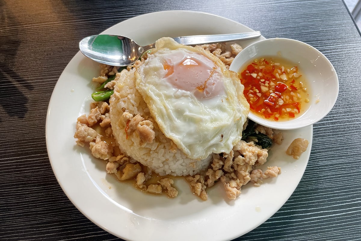 上に乗った半熟の目玉焼き、これを見るだけでテンションが上がってしまう。目玉焼き、ごはん、具材をまぜて食べても、別々に食べてもおいしい。この自由度の高さこそガパオの魅力だ。どう食べても、ひき肉の旨味と卵のまろやかさが。しっかりと味の染み込んだライスと混ざり合って最高においしい!ガパオを提供するお店は多くあれど、ここまで自分好みな味わいのガパオはなかなか無い!