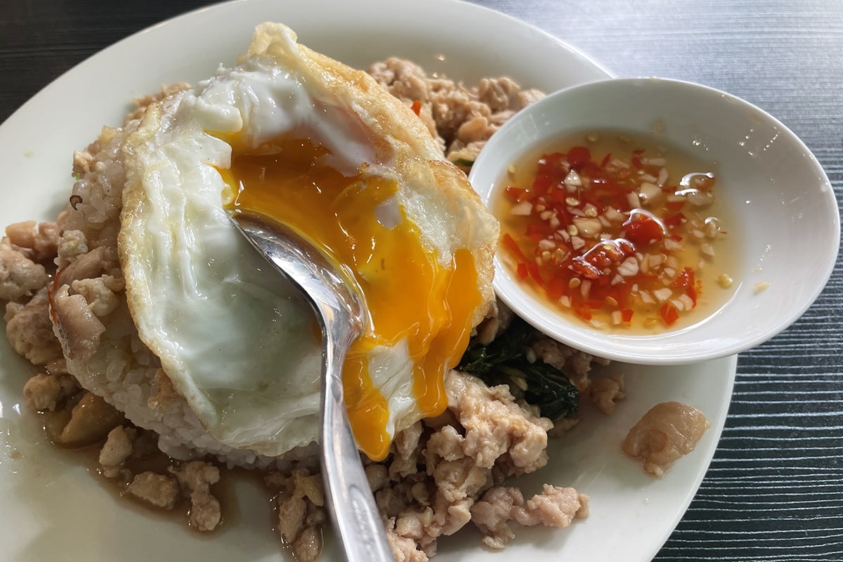 一緒についてくる唐辛子の入った特製ナンプラーはお好みで。見た目の割に、辛さも程良くマイルドで辛いのが苦手な人にもおすすめだ(とはいえ辛いのが苦手な人はちょっとずつどうぞ)。ナンプラーのちょうどいい塩辛さが、ガパオのコクをより奥深いものにしてくれる。