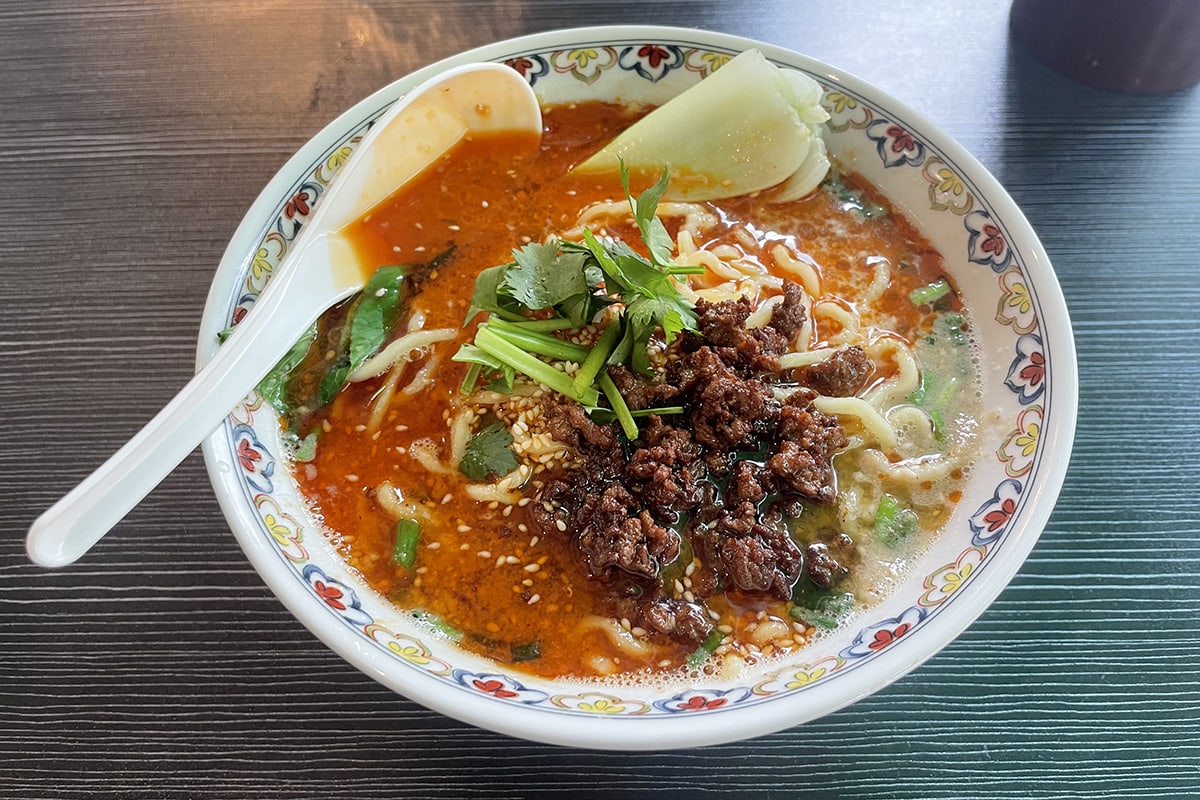 2日続けてのチャオバンブーとなった(ある意味幸せ)、もう1人の編集部員は「昼はサクッと麺が良い」と見た目もあざやかな坦々麺をチョイス。粗めの肉味噌、ゴマ、パクチーなどたくさんの具材がはいったピリ辛のスープにモチモチの麺が、しっかり絡んでやみつきになるおいしさ。青梗菜のシャキシャキ食感も良い箸休めになる。チャオバンブーはやっぱり何を食べてもおいしい!