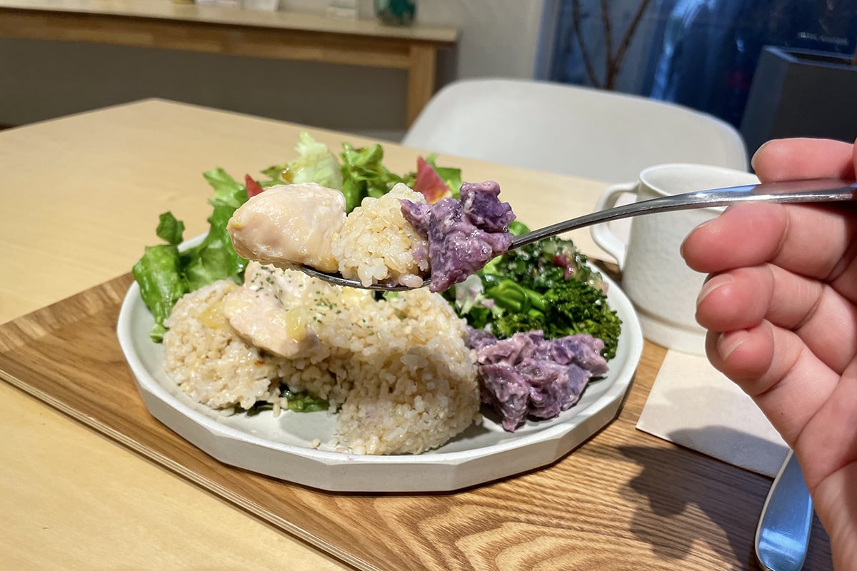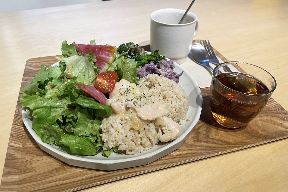 このプレートの魅力は、玄米や無添加の野菜とともに良質なミネラルやタンパク質など身体に良い成分を摂取することができること。メインの鶏むねは、クリーミーな豆乳感と無添加玄米味噌の香ばしさがたまらない。腸活に良いとされている味噌と栄養たっぷりの豆乳が使われていて、こちらもおいしくヘルシーだ。