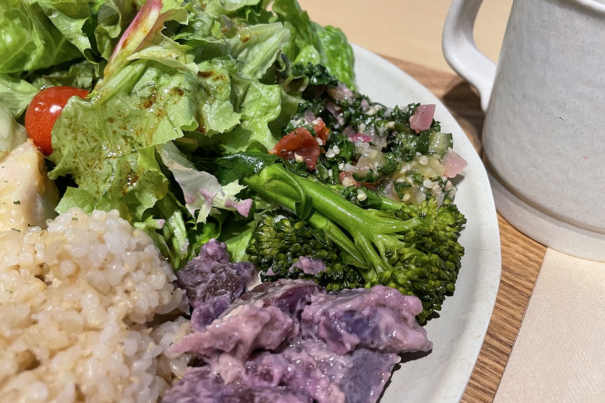 食べたもの:「WEEKDAY TODAY'S LUNCH」/玄米、鶏むね肉の味噌豆乳、レタスのサラダ、紫芋のサラダ、バジルと玉ねぎのサラダ、味噌汁(1,430円)