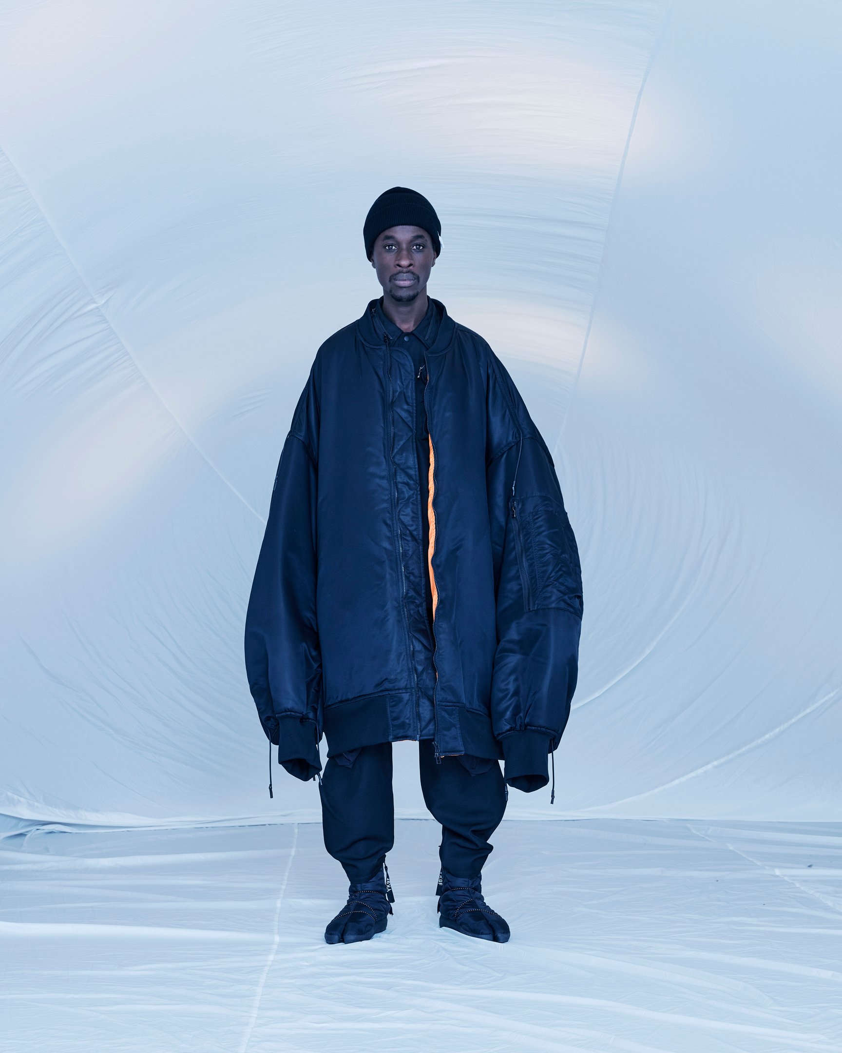ポップアップでは、今年3月に行われたヨシオクボのプレゼンテーション「Different Dimension」で使用した3m×10mの巨大な円筒を設置し、薄い生地で作られた巨大なドームが印象的な空間を演出する。