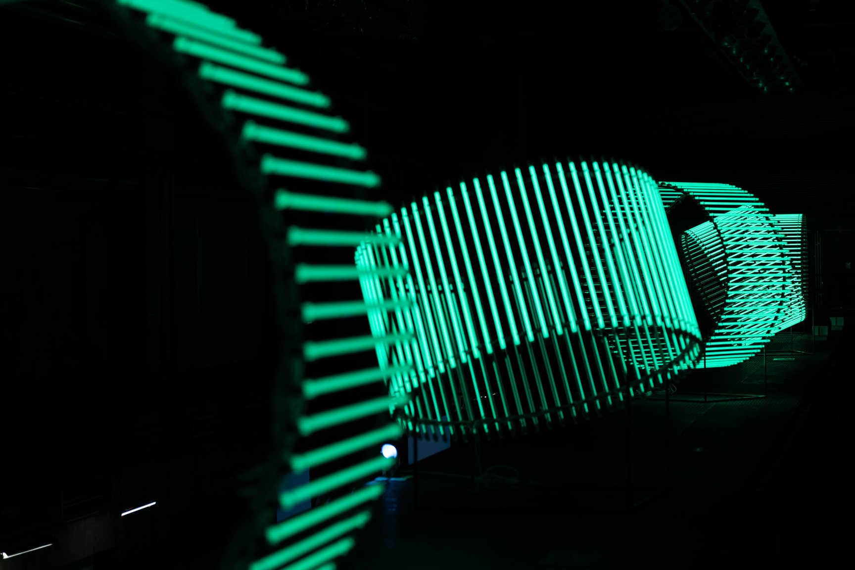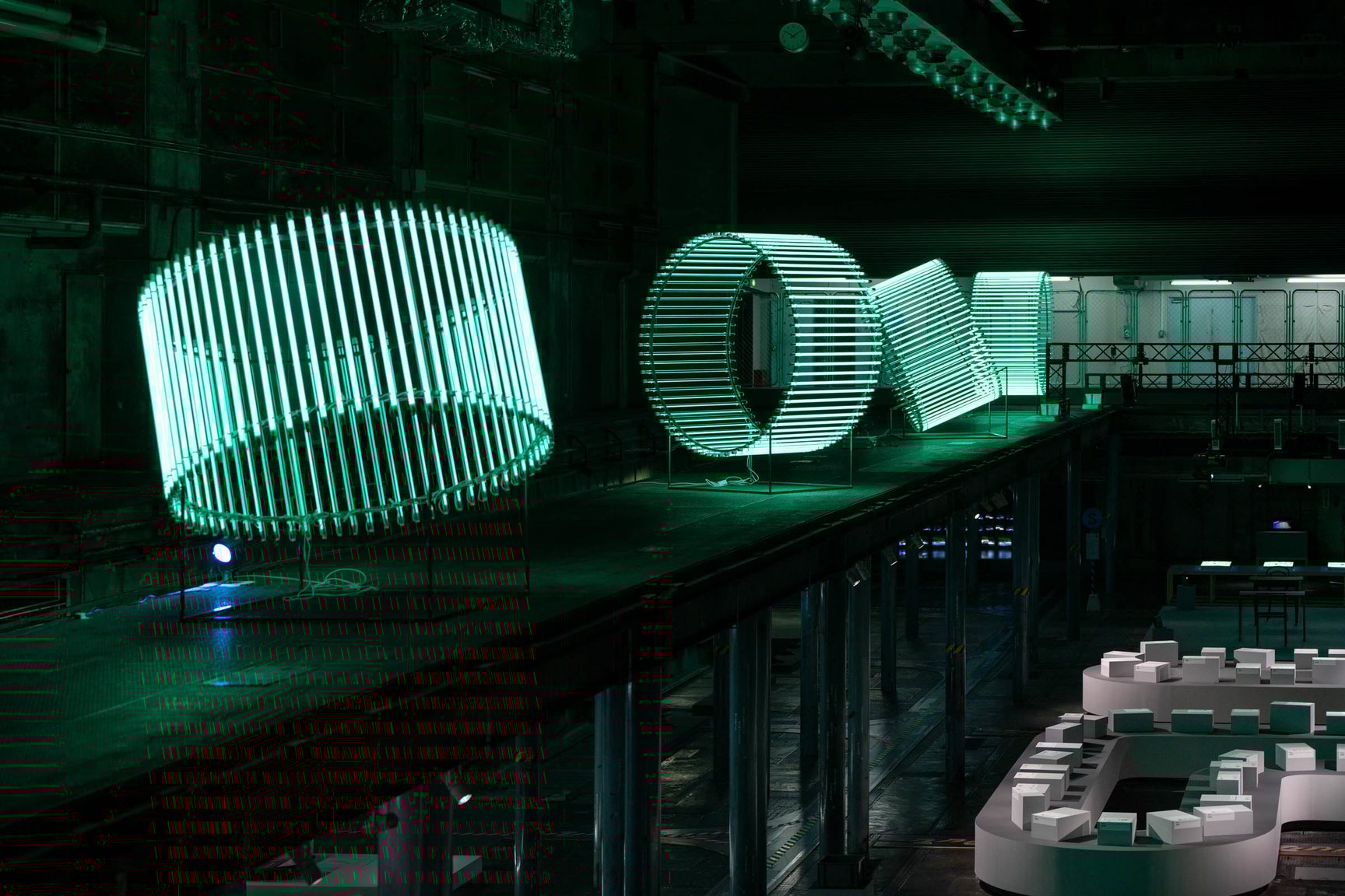 今回のインスタレーションは、今年4月にソニーパークミニで展示をした「Static Lights : Unfamiliar Presences」の続編シリーズで、11月には「Sony Park 展 KYOTO」で初公開し話題を呼んだ作品。緑色に光る72本のLED蛍光灯を円形状に配置したオブジェが、5つのチャプターごとに回転し、変化するインスタレーションとなっている。