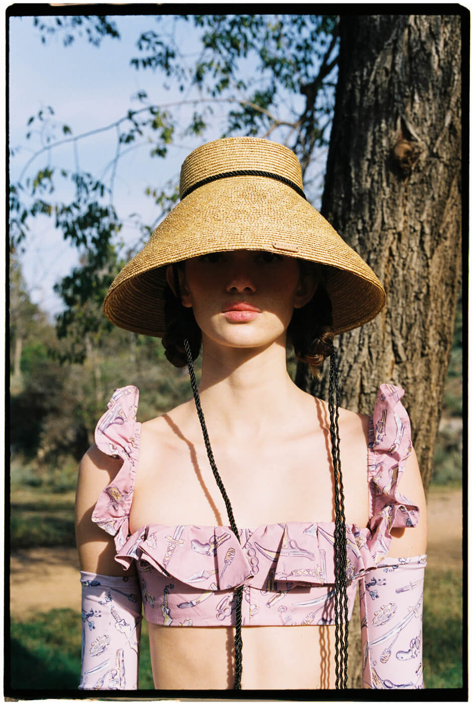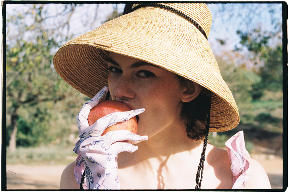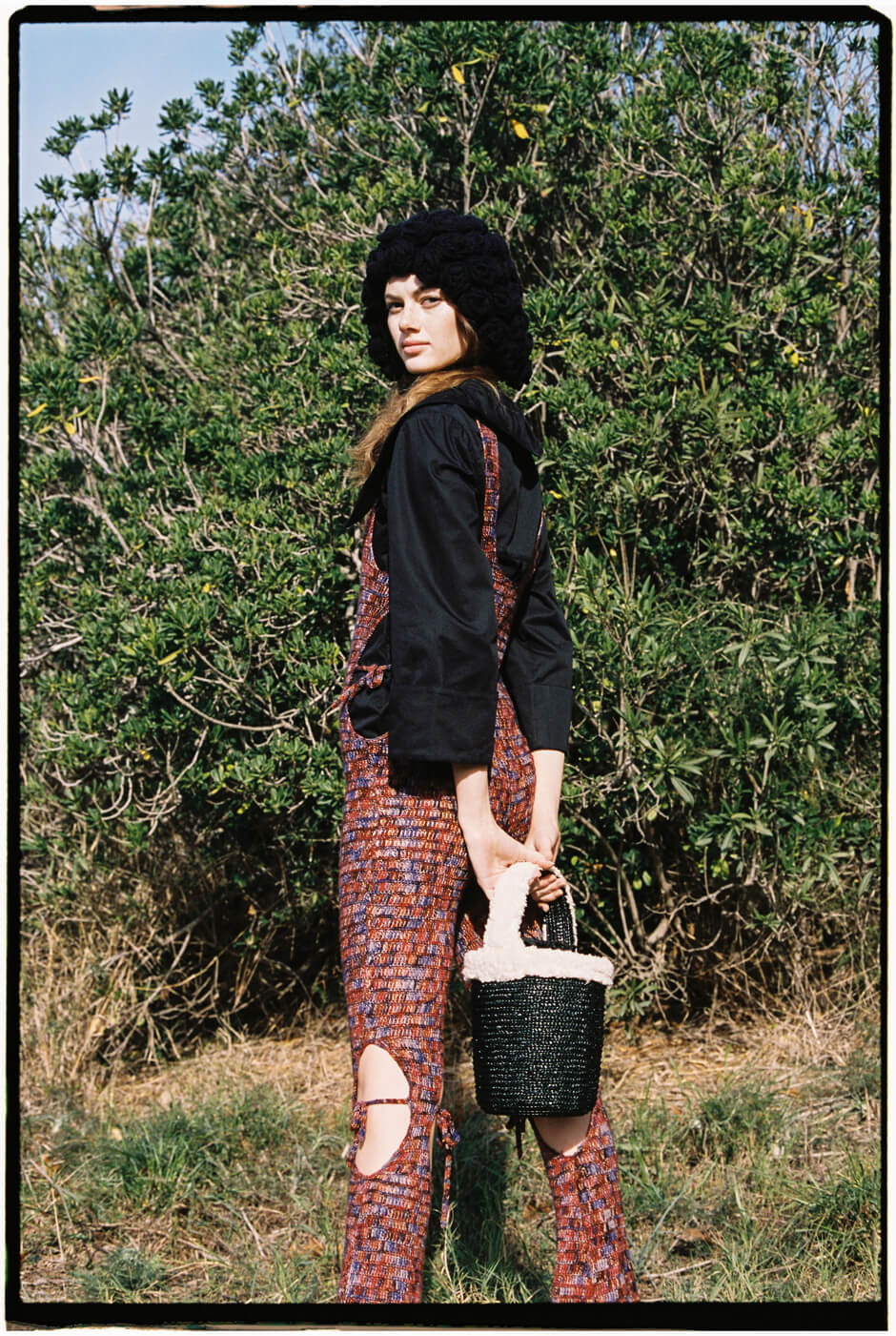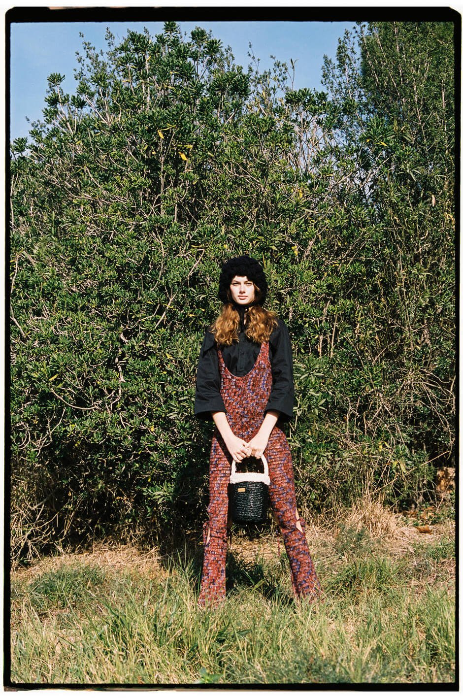 jumpsuit by PAULA OLIVELLA RUIZ, shirt and hat by ZOÉ FILANDEAU, bag by ZAHATI, socks and shoes stylist’s own