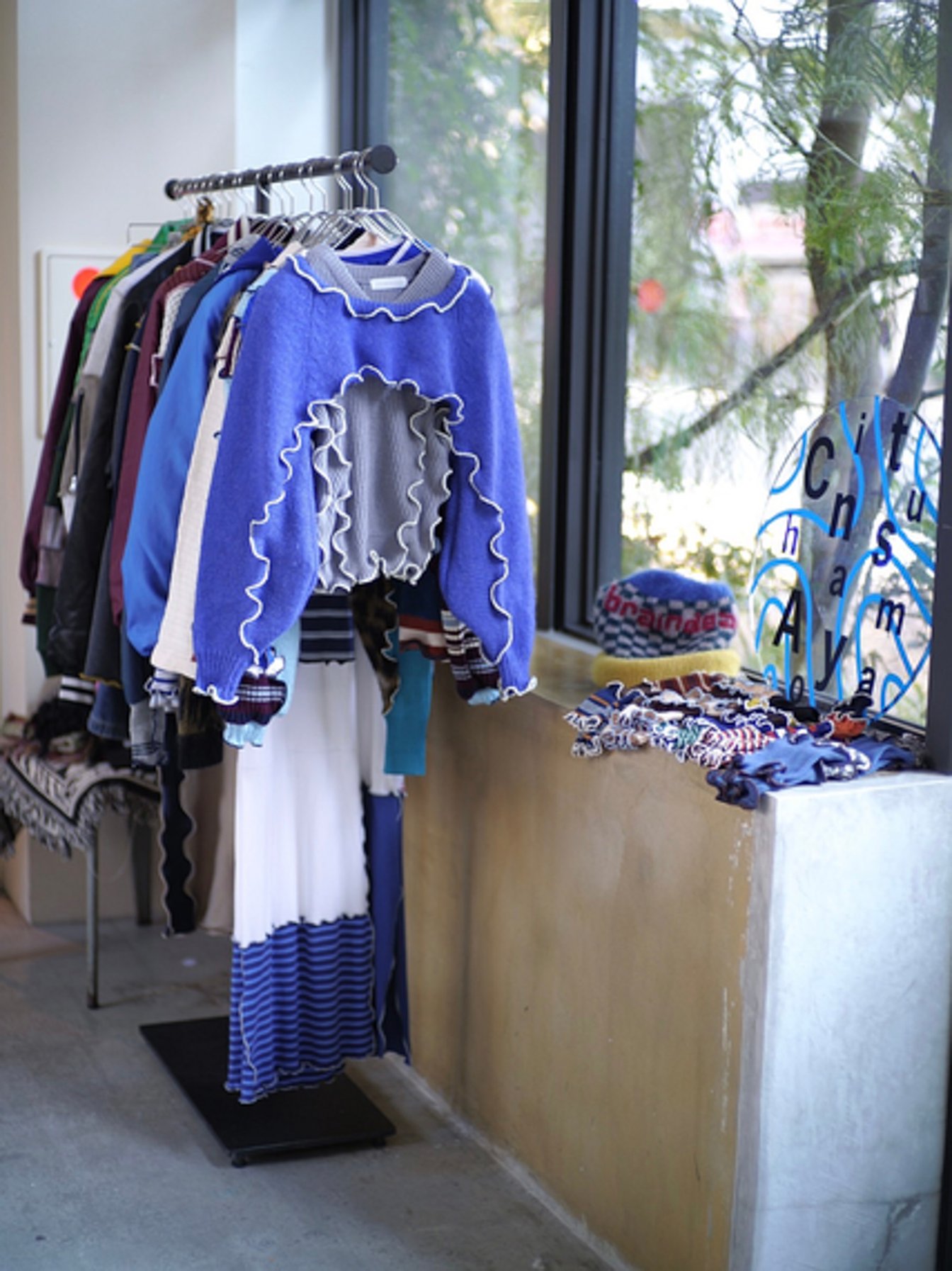 オリジナルで打ち出すリメイク、アップサイクル商品は、店舗に併設したアトリエのリサークルスタジオを軸に商品化している。アランニットやキルティングライナーを活用したシリーズをはじめ、メローロックミシンを活用したデザインで春からブランドにした「チナツアオヤマ」などが人気だ。