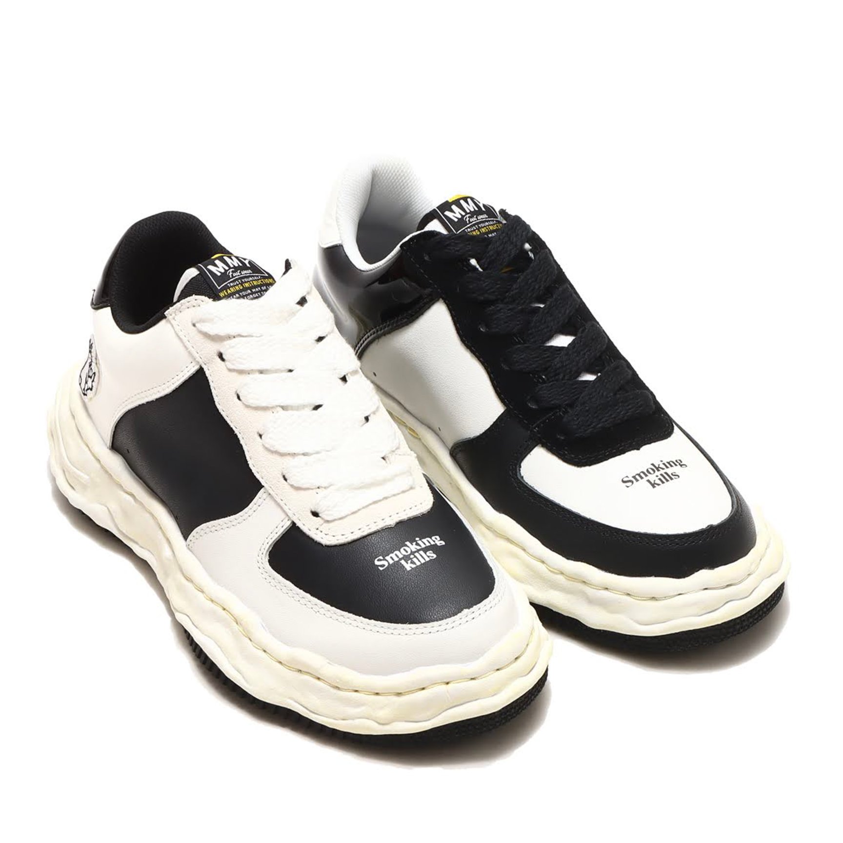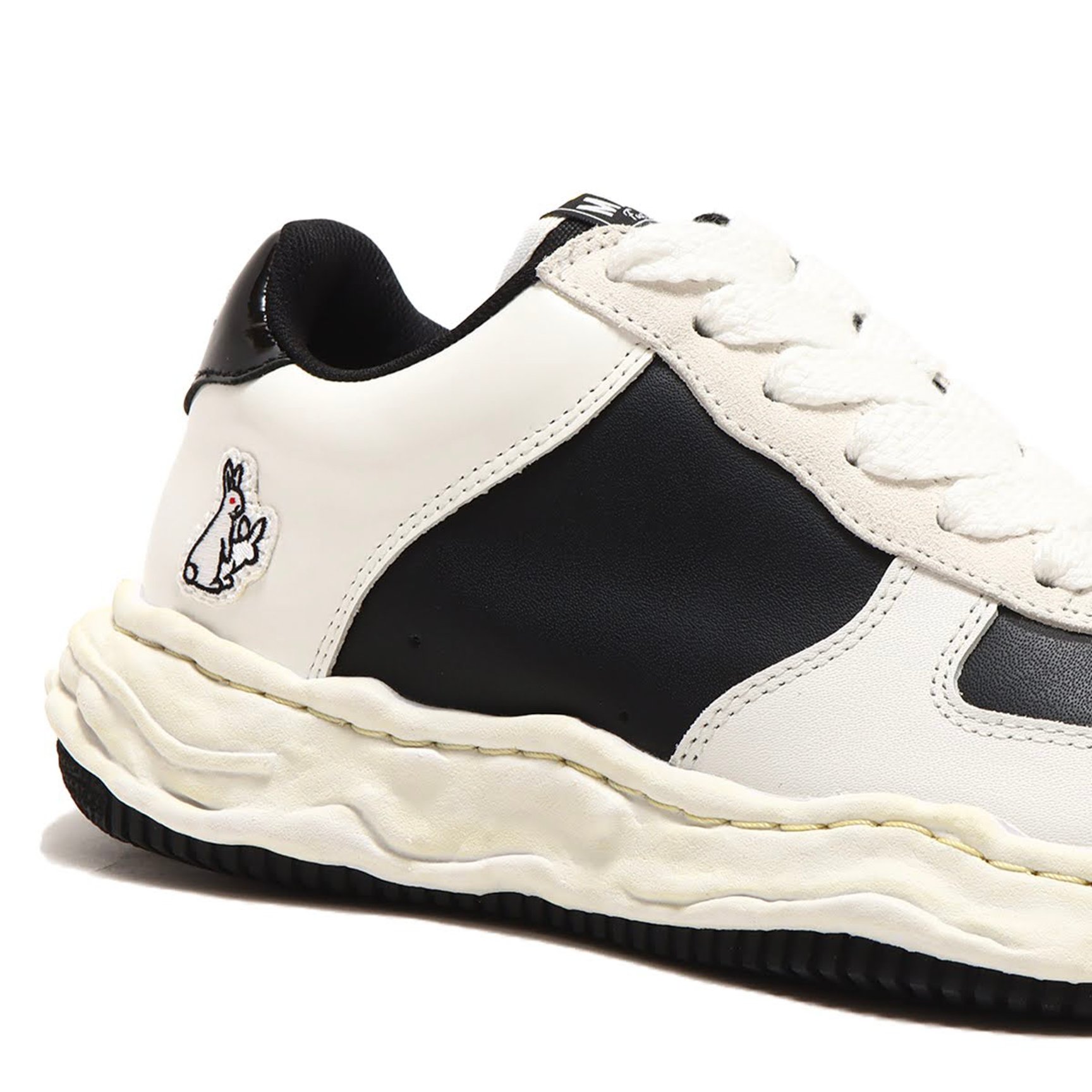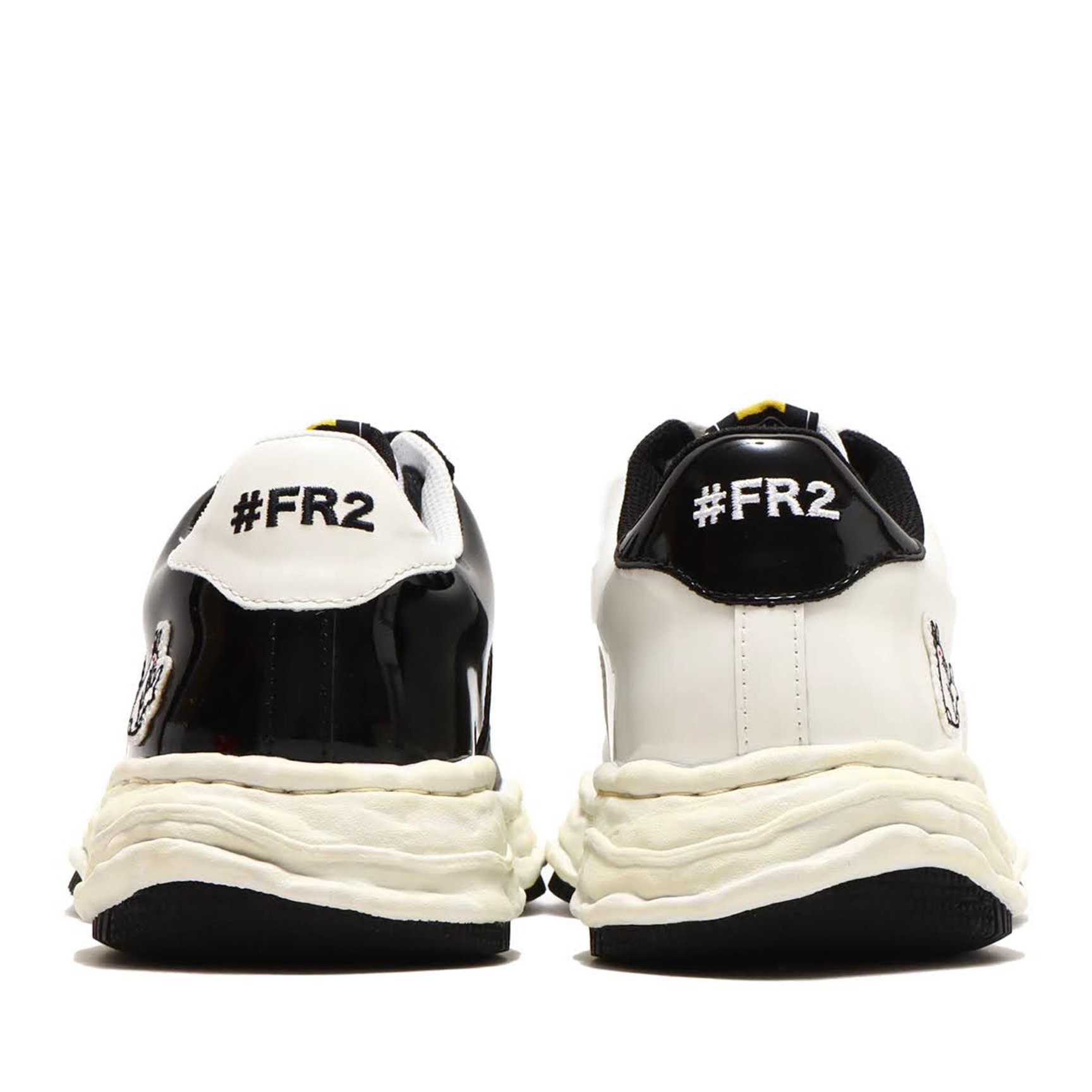 今回は、メゾン ミハラヤスヒロのデザイナー三原康裕が粘土で製作したオリジナルソールのシューズ「WAYNE LOW」をベースに、「カッコいいスニーカーとは何か」を突き詰めたという一足を用意。アッパーは、パテントレザーやスエード、スムースレザーといった上質な素材を組み合わせたパッチワーク風のデザインで、ヒールにはエフアールツーのラビットワッペン、トゥにはブランドアイコンのSmoking Killsをあしらった。ミッドソールにはヴィンテージライクな加工を施し、ソールの形状を強調。インソールには3ブランドのロゴがあしらわれている。サイズは23〜28.5cmを用意。価格は4万8400円。