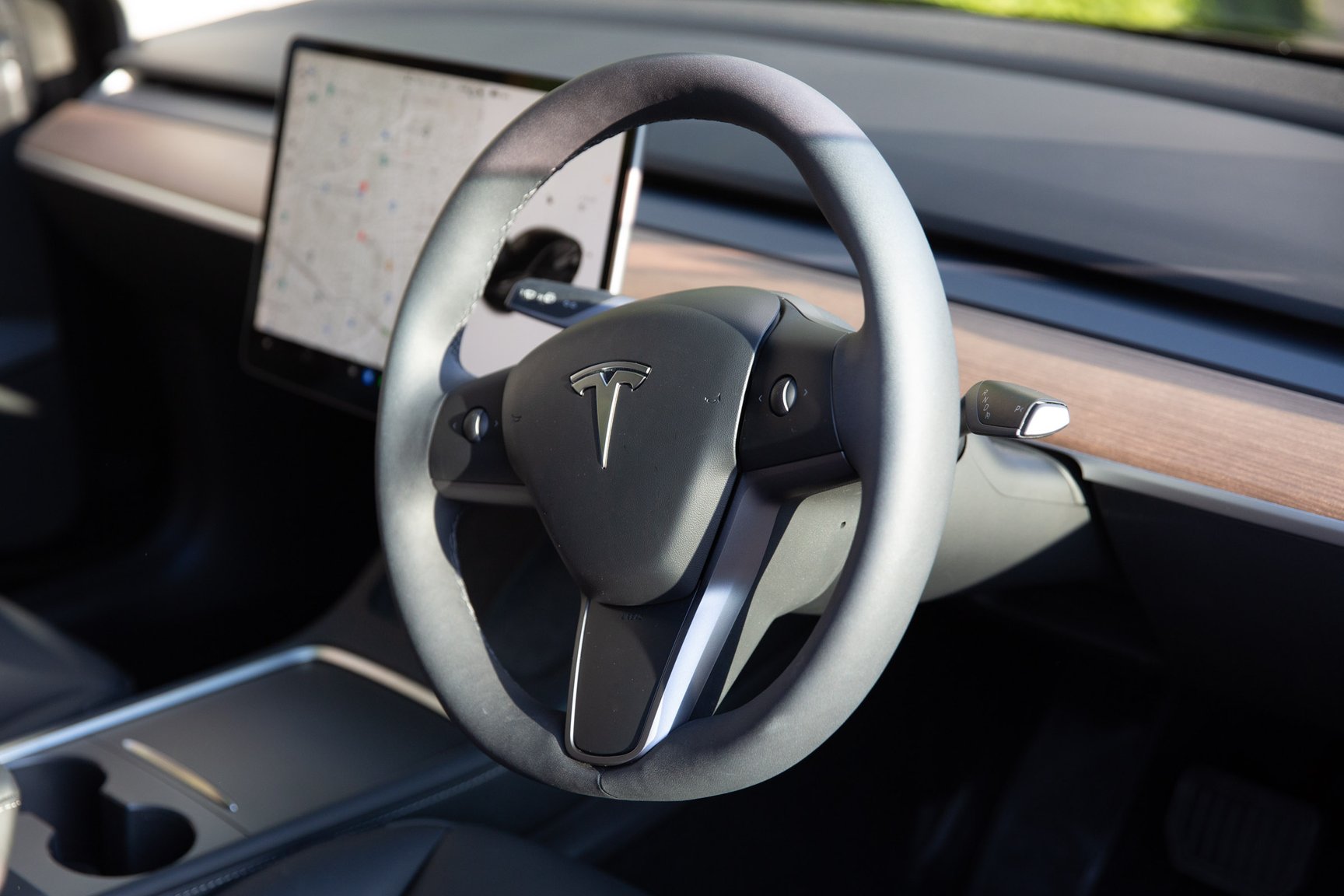 F:運転席はハンドルとタッチスクリーン以外何もなくて広々としています。テスラを選んだ理由は?