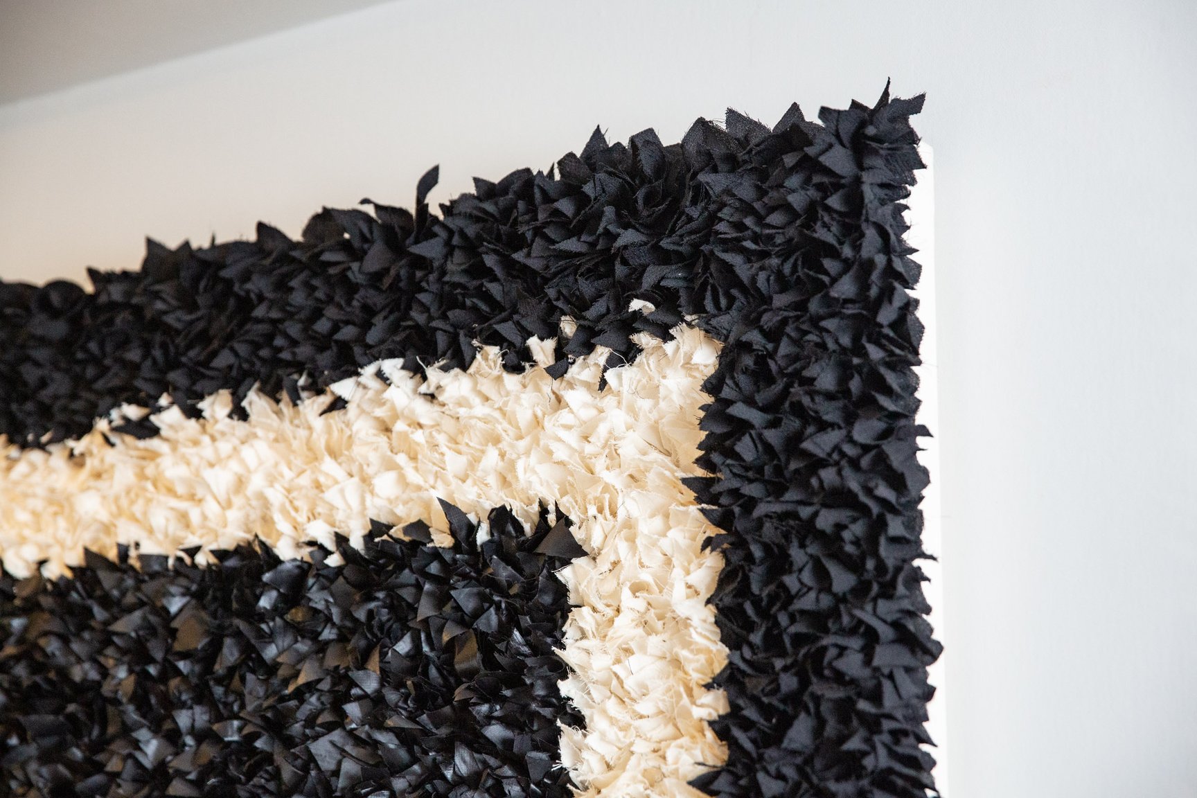 黒石奈央子(以下、黒石):布の端材を組み合わせて作られた作品です。直感で見た目が可愛かった、というのもあったんですけど、環境に配慮した作品づくりに共感して、エントランスに飾ってみようかなと思って購入しました。