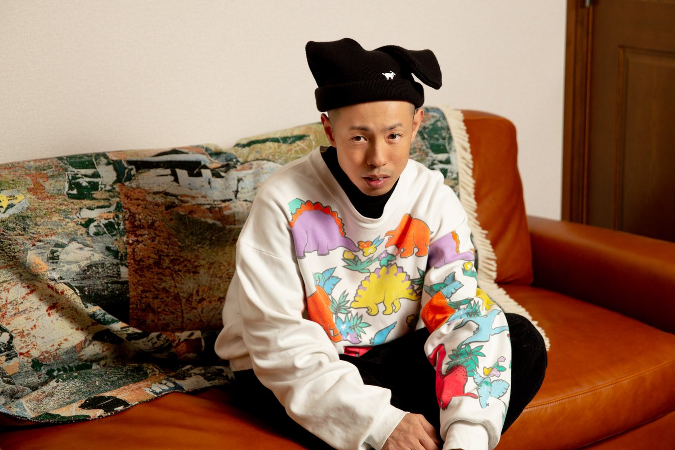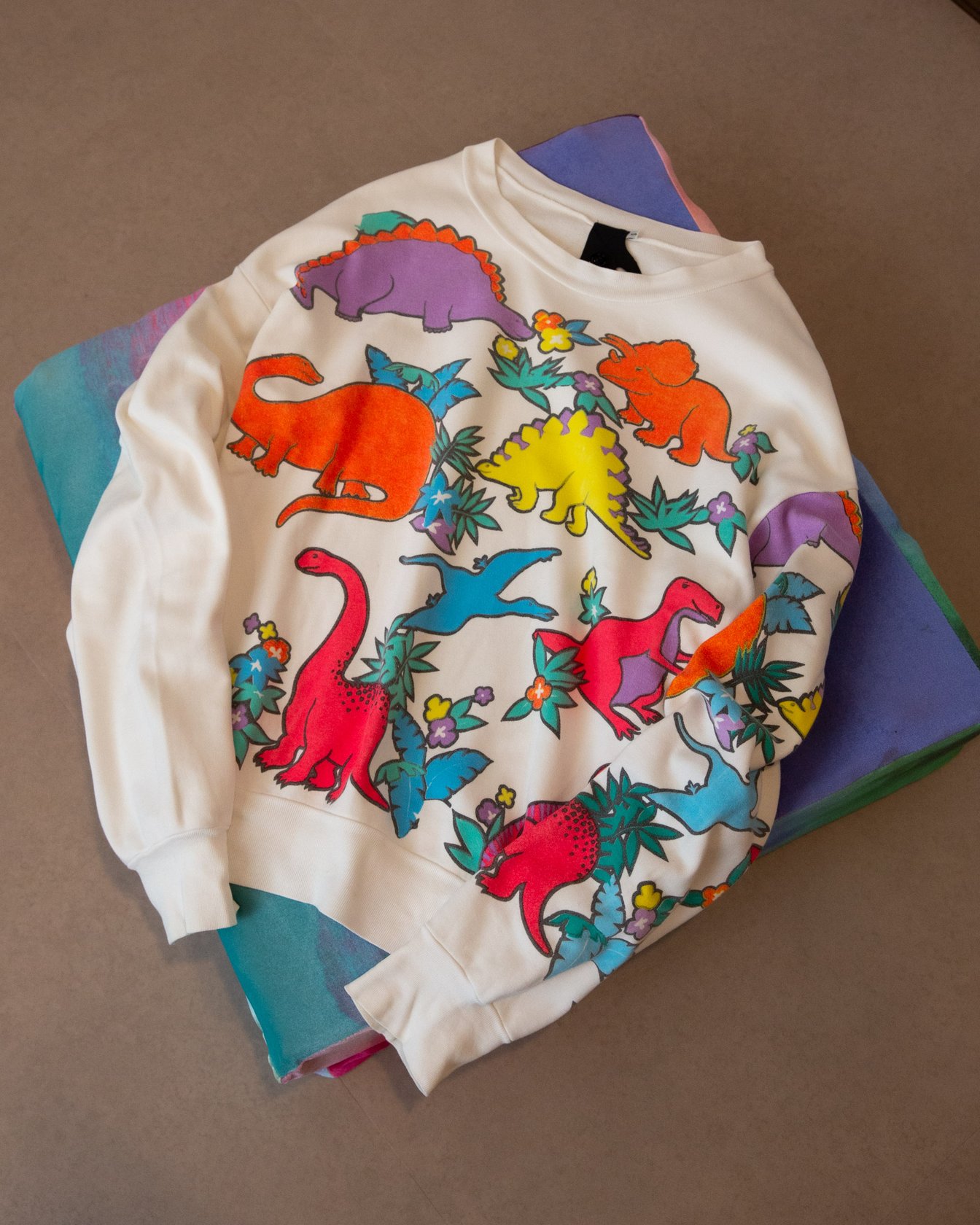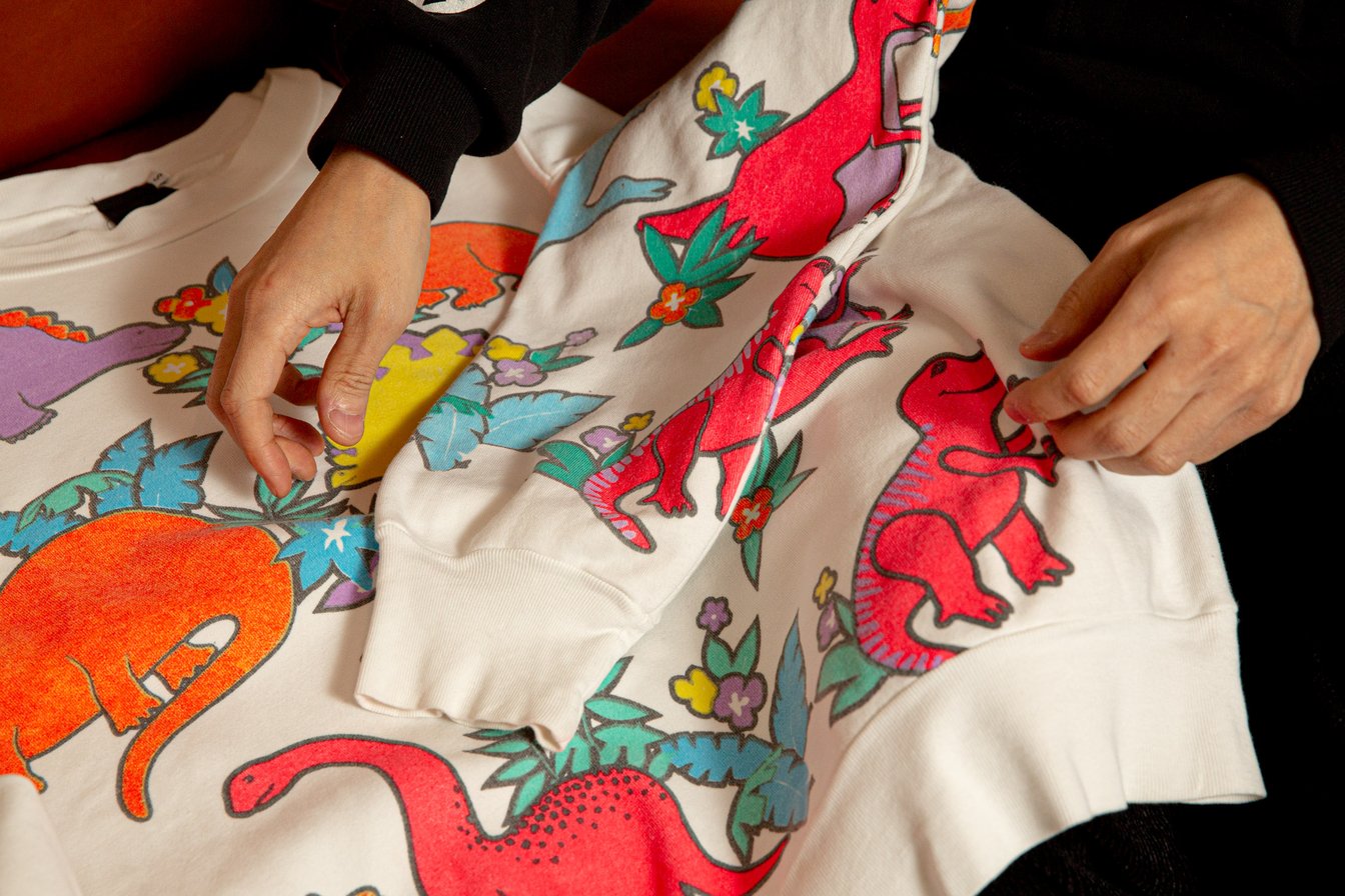 FASHIONSNAP(以下、F):今日は仕事場兼ご自宅にお邪魔しています。衣装部屋にある膨大な数の服の中から今年のベストバイを選んでいただきました。まず1点目は、カラフルなダイナソープリントのスウェットですね。