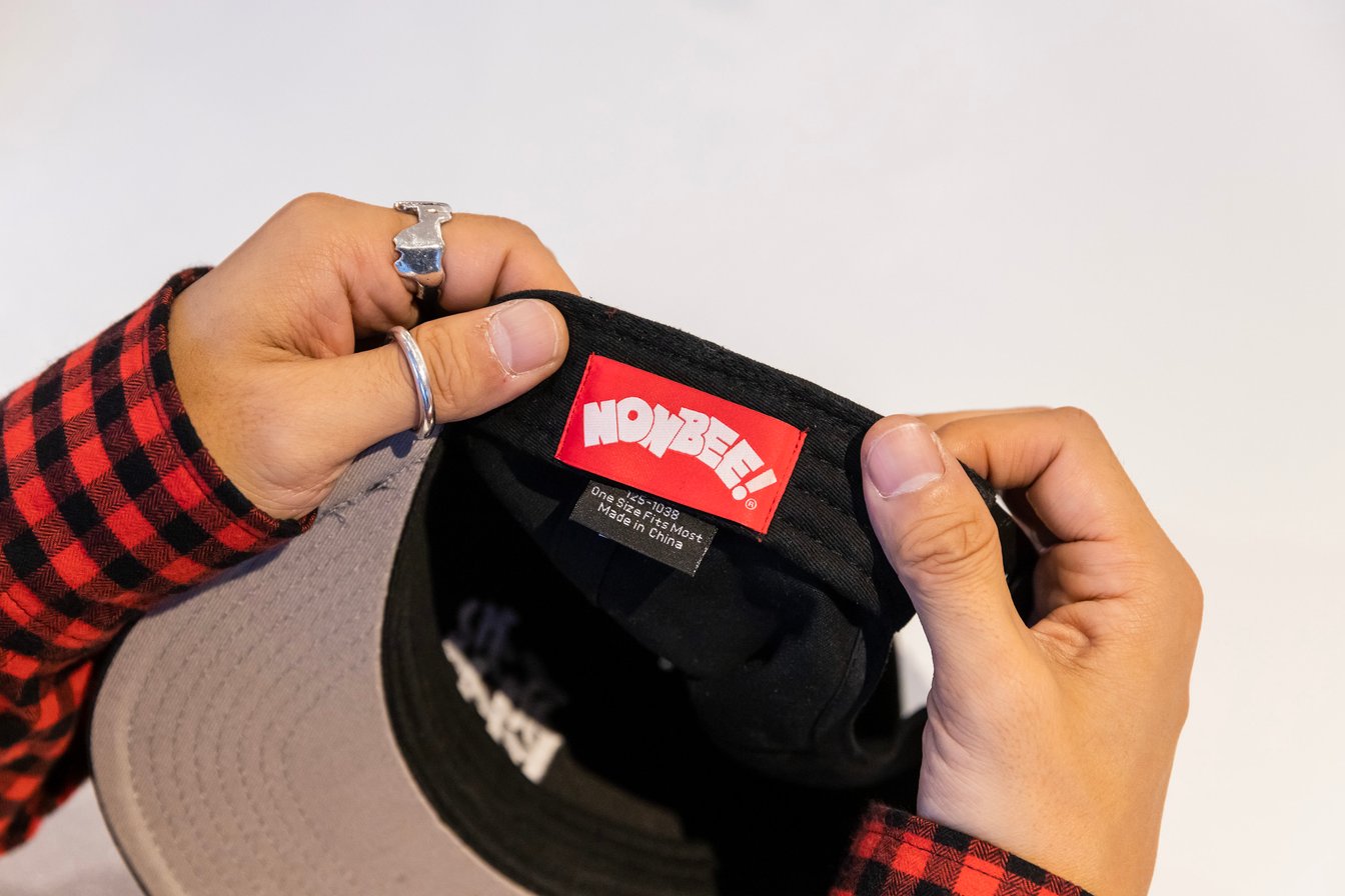 F:こちらは「ノンベー(NONBEE!)」のベースボールキャップですね。"酔"と"酒"の刺繍がインパクト大です(笑)。