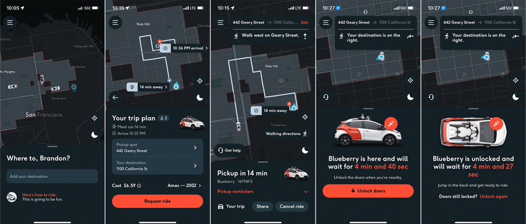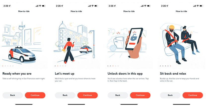 まずは車に乗る前のアプリに “乗る” ためのオンボーディング体験。これはかなりスムーズで、UberやLyftなどの有人ライドシェアアプリに慣れていれば、かなりわかりやすい。
