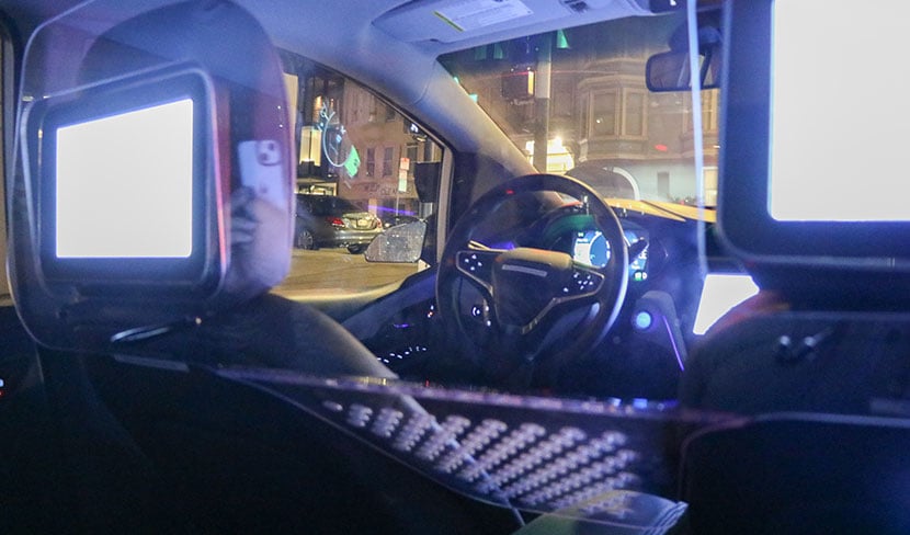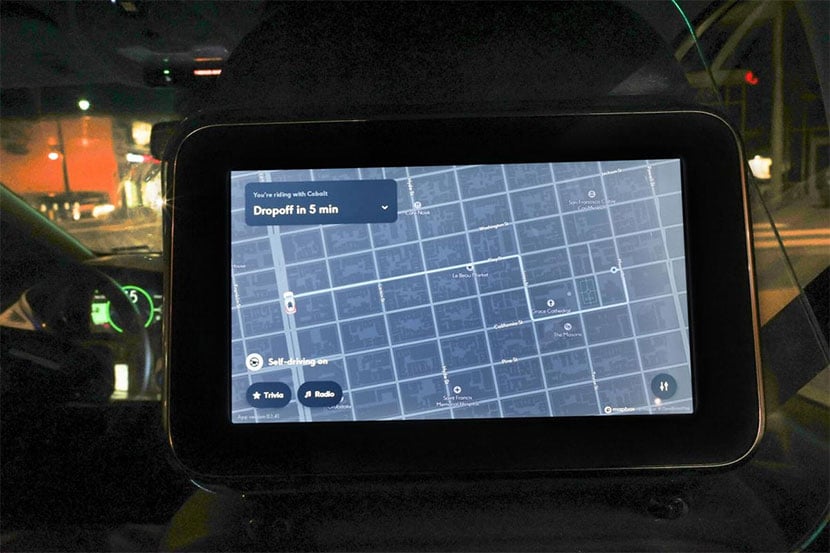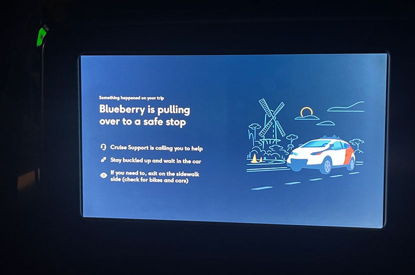 実際に乗ってみると、座席の前に二つのタブレットが設置され「Cruiseへようこそ。まずはシートベルトをお締めください。シートベルトが装着され次第出発します。」という自動アナウンスが流れた。