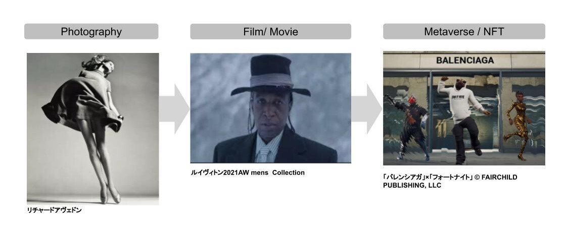 昔のいわゆる4マス(TV、ラジオ、新聞、雑誌)と言われる時代から、インターネットの普及によってラジオ的な役割をしているのがTwitterであったり、新聞的な役割をしているのがウェブメディアやブログであったり。そんなふうにチャネルごとに変化してきているなかで、表現方法としてのファッションは平面からYouTubeが生まれて、そしてコロナ禍でコレクションのライブ配信が行われるなど、大きく変化してきています。写真、動画ときて次は、という流れでメタバースというのは非常に理にかなった流れです。例えばMMOで同時接続をした3D空間でファッションを表現するというようなことが次の段階として存在していると考えます。