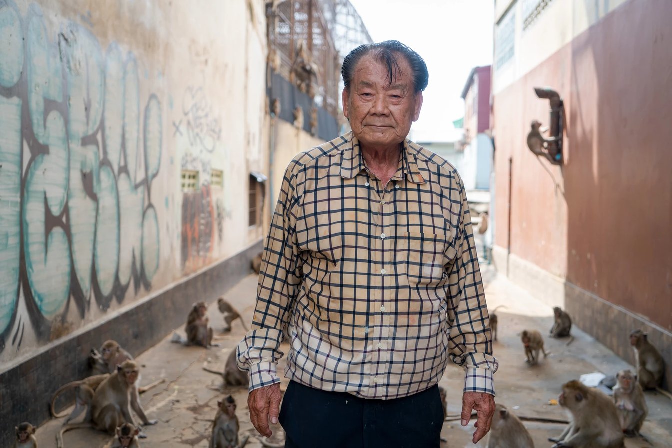 猿が駆け回るロッブリーの路地に立つ、祭りの創始者で地元の経営者のヨンユット・キットワタヌサン。PHOTO: TEIRRA KAMOLVATTANAVITH