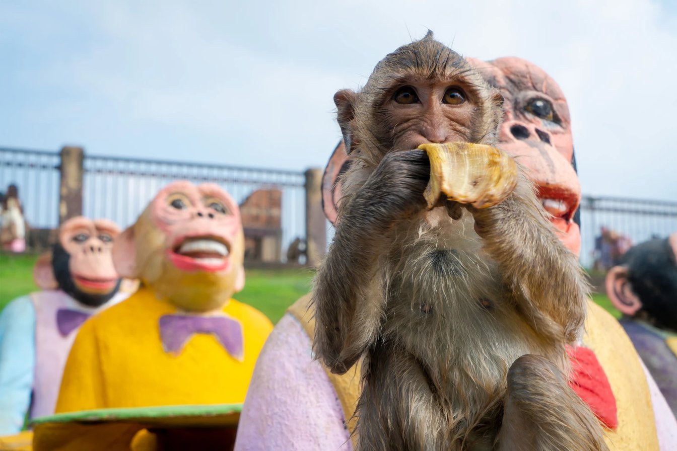 猿のウェイターの像に乗ってバナナをかじる子猿。PHOTO: TEIRRA KAMOLVATTANAVITH