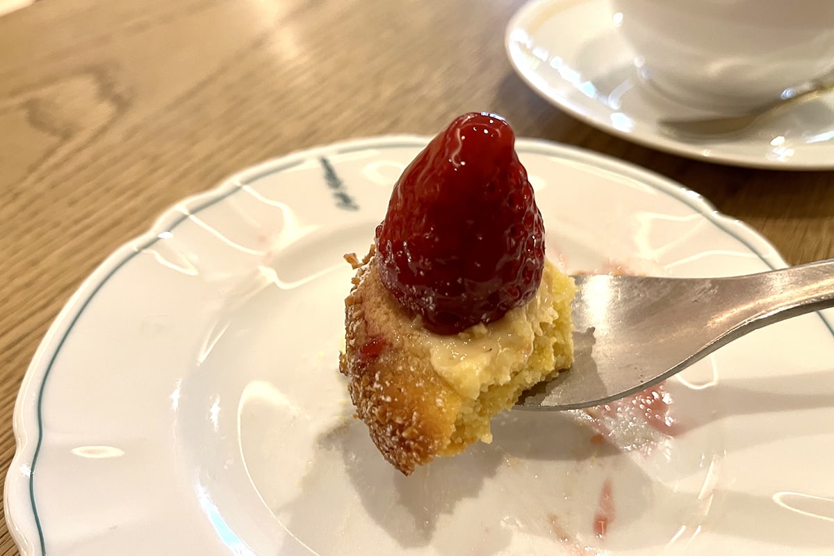 甘酸っぱいいちごと、ほんのり塩気のあるタルトの黄金比に思わず笑顔になってしまうおいしさだ。タルトの土台はココナッツのサブレブルトン(塩とバターのクッキー生地)になっている。タルト部分だけ食べてもおいしいのだが、中には濃厚なカスタードがたっぷり。上に乗せられたいちごはラズベリージャムでコーティングされており、甘みが口いっぱいに広がっておいしい。