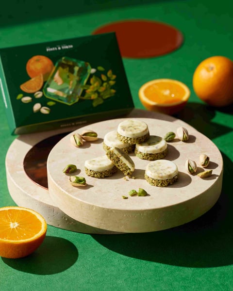 「ピスタチオショコラクランチ ピスタチオ&オレンジ」(税込1215円/5個入り)は、オレンジピール入りのショコラクランチの上に、ピスタチオ入りのホワイトチョコレートを重ねた、2層仕立てのスイーツです。