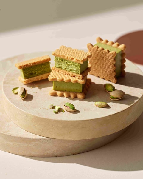 ピスタチオベイクドチーズケーキを、しっとりサブレでサンドした「サブレサンドピスターシュ」(税込1458円/3個入り)は、かわいらしいサイズ感も魅力的。