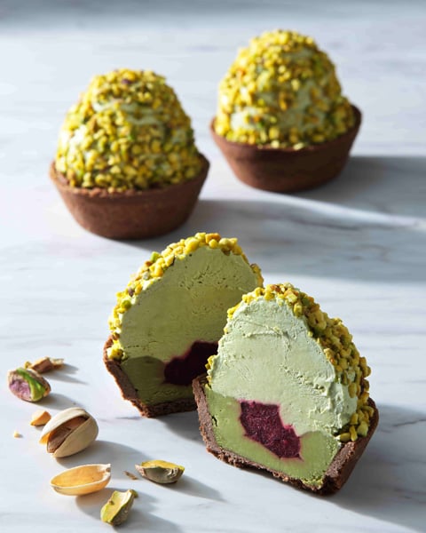 各日15時から販売される「ピスタチオタルト ピスタチオ&グリオットチェリー」(税込1728円/3個入り)は、中に深紅色のグリオットチェリーが隠れた、ピスタチオづくしのタルト。